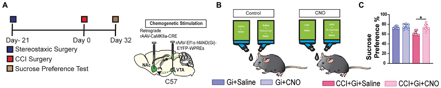 Inhibition of glutamatergic neurons projected from VTA to NAc can reduce the pain-induced decrease in sucrose preference, and this behavior. (A) Experimental timeline. Schematic illustration depicting viral constructs. For the chemogenetic stimulation a retrograde CaMKIIa-CRE viral vector was injected in the NAc brain region, and DIO-hM4D(Gi)-EYFP was injected in the VTA, mice were given 21 days for the expression of the virus before the CCI surgery, the sucrose test was performed at the 32 days post-surgery in the CCI-induced mice along with the mice without CCI surgery. (B) The illustration of the oral route of CNO infusion, CNO was mixed with water and 1% sucrose solution and the control group fluids were prepared without the presence of CNO drug. (C) Statistics data showing that CCI + Gi + Saline exhibited a significant decrease compared with CCI + Gi + CNO, Gi + Saline and Gi + CNO (n = 7, 7, 8, 8 mice; *p < 0.05) during the testing of sucrose preference of 24 h (All the data were measured by one-way ANOVA followed by the Dunnett’s test).