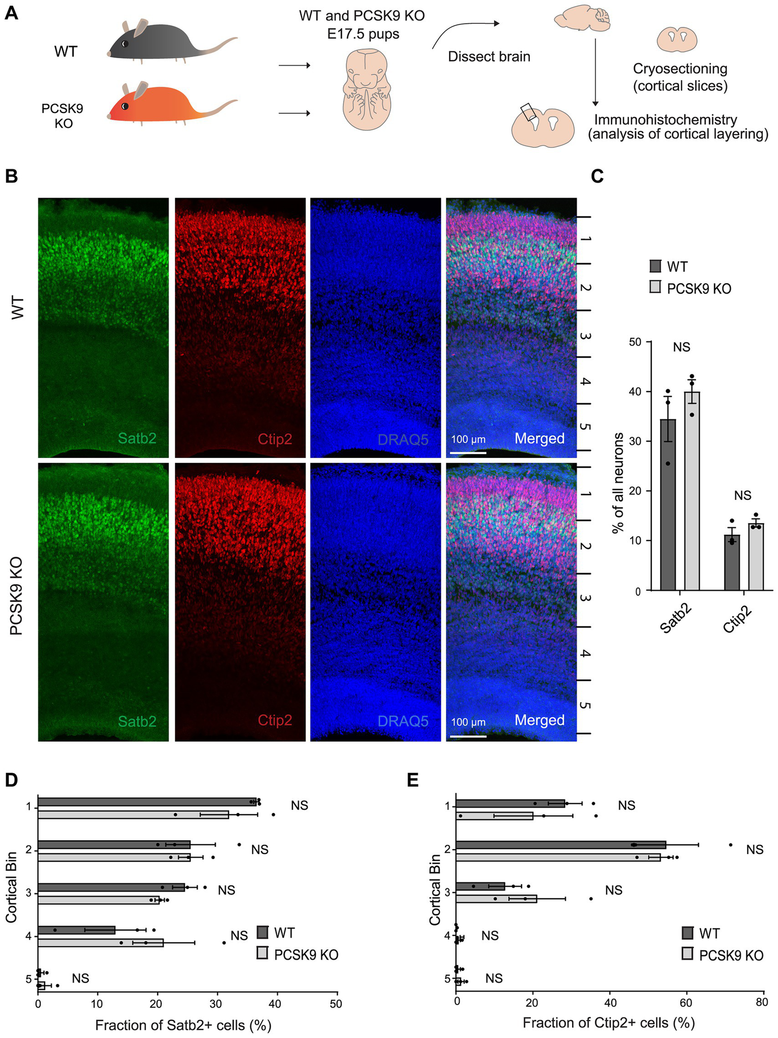 Lack of PCSK9 during development does not affect the fate of cortical progenitor cells. (A) Schematic representation of the experiment. (B) Representative images of immunostaining signals (Satb2, Ctip2, and DRAQ5) in WT and PCSK9 KO E17.5 cortices. (C) Quantification of the fraction of all neurons (DRAQ5 labelled) expressing indicated fate markers (Satb2, Ctip2) in WT and PCSK9 KO E17.5 cortical slices (see also Supplementary Table S1A). (D,E) Quantification of laminar distribution of cortical neurons labelled with Satb2 (D) or Ctip2 (E) fate markers in WT and PCSK9 KO E17.5 cortical slices (see also Supplementary Table S1B). Cortical bin – the maximum height of the cortical slice was divided into 5 bins of identical dimensions. Results on graphs are represented as average percent ± SEM. For statistical analyses two-way ANOVA with Bonferroni multiple comparison test was performed, alpha = 0.05. All p values were above 0.05 and considered non-significant; n = 3 WT, 3 KO.