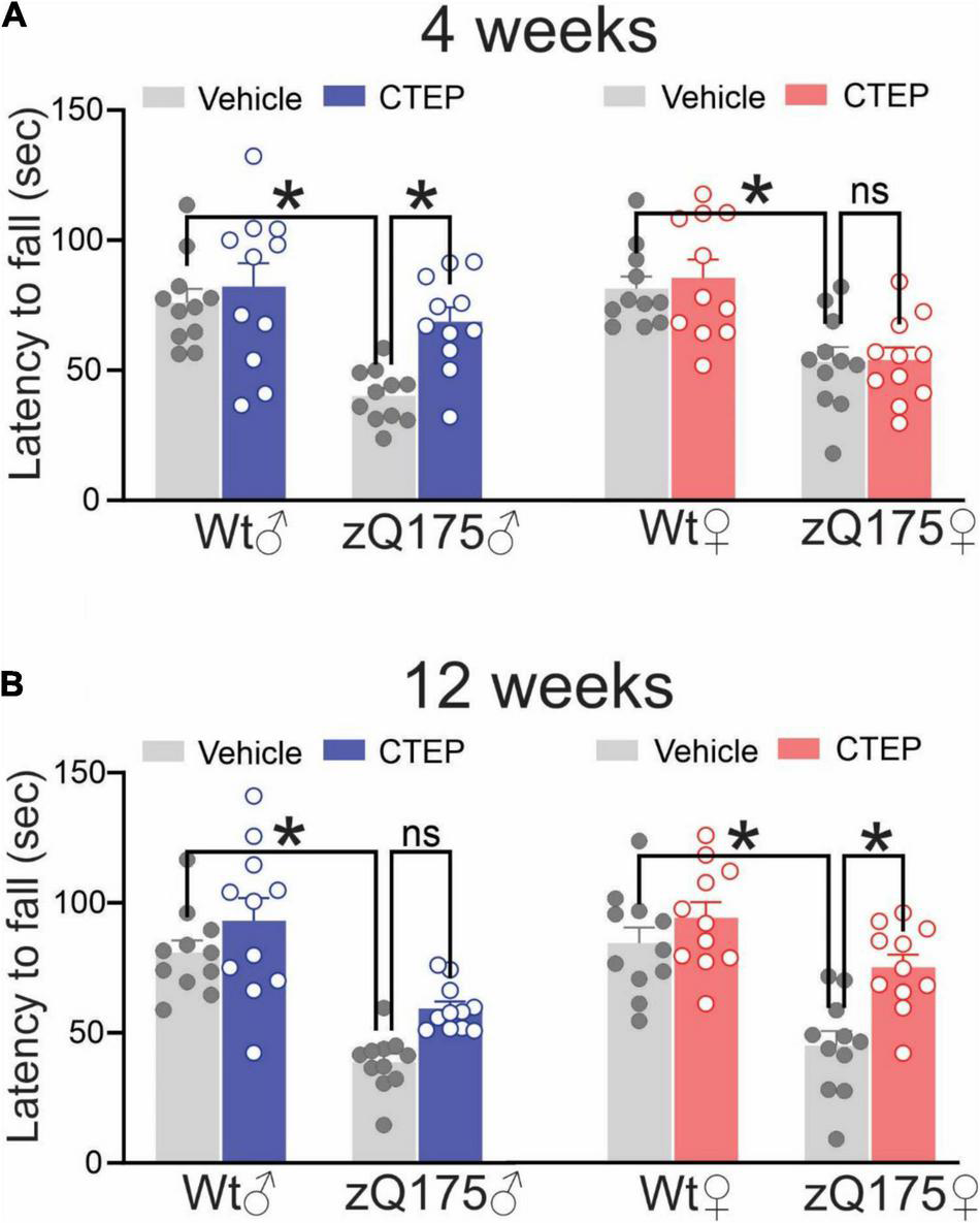 Effect of chronic administration of CTEP on rotarod performance in male and female zQ175. Mean ± SEM of latency to fall (sec) from accelerating rotarod after 4 weeks (A) and 12 weeks (B) of treatment with either vehicle or CTEP (2 mg/kg/48 h) of 12-month-old heterozygous zQ175 (zQ175) and wild-type (Wt) male and female mice (n = 11 for each group). *P < 0.05 by three-way analysis of variance (ANOVA) and Tukey’s multiple comparisons test.