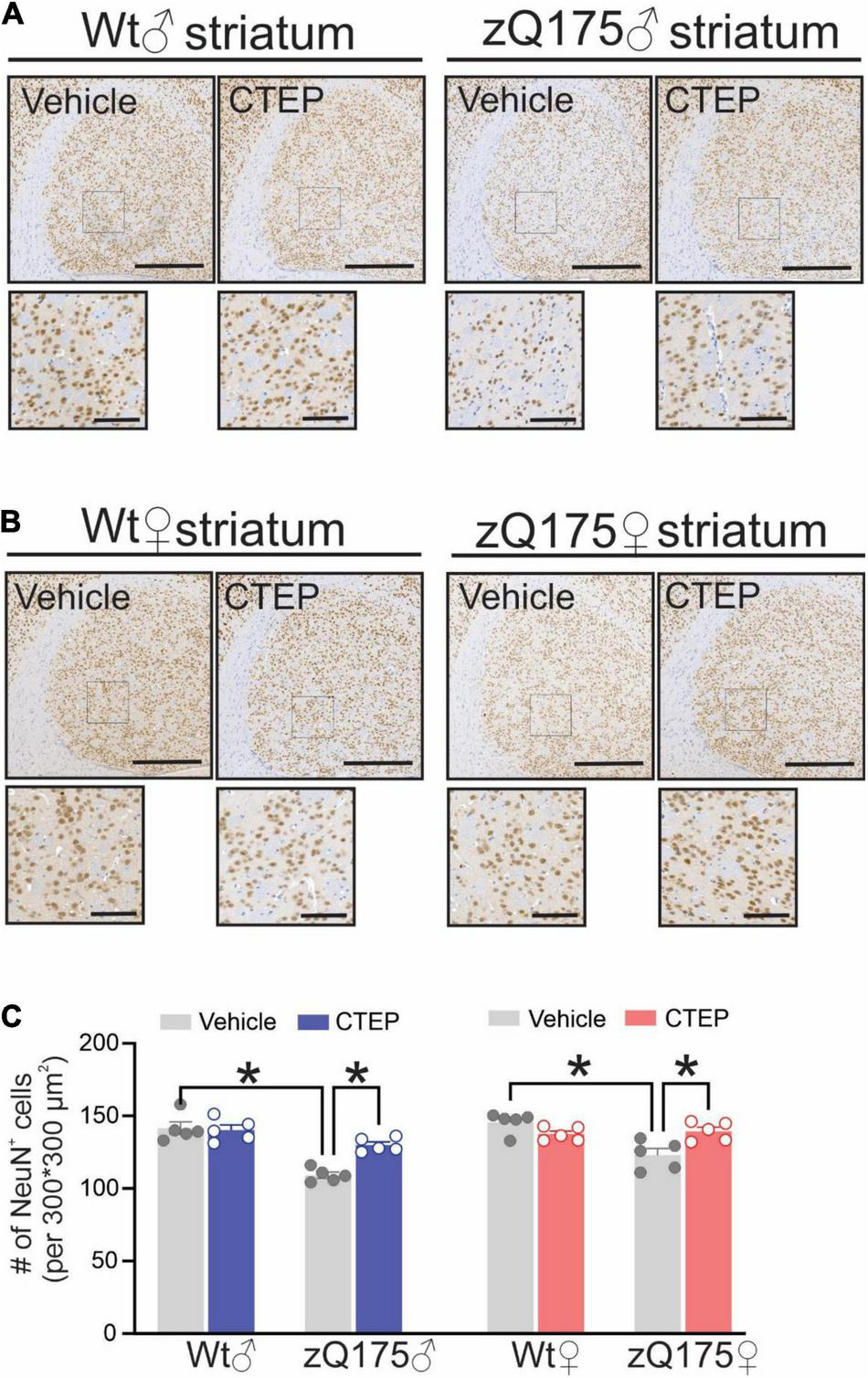 Effect of chronic administration of CTEP on neuronal survival in male and female zQ175 mouse striatum. Representative images of staining for neuronal nuclei (NeuN)-positive cells in striatal brain slices from 15-month-old male (A) and female (B) heterozygous zQ175 (zQ175) and wild-type (Wt) mice after 12 weeks of treatment with either vehicle or CTEP (2 mg/kg/48 h). Scale bar = 500 μm for whole striatum and 100 μm for magnified areas. (C) Quantification of the number of NeuN-positive cells in striatal brain slices from 15-month-old male and female zQ175 and Wt mice after 12 weeks of treatment with either vehicle or CTEP. Data are quantified from two different 300 × 300 μm2 striatal regions of 6 sections per mouse and five independent mouse brains from each group were used for analysis. Data are mean ± SEM. *P < 0.05 by three-way analysis of variance (ANOVA) and Tukey’s multiple comparisons test.