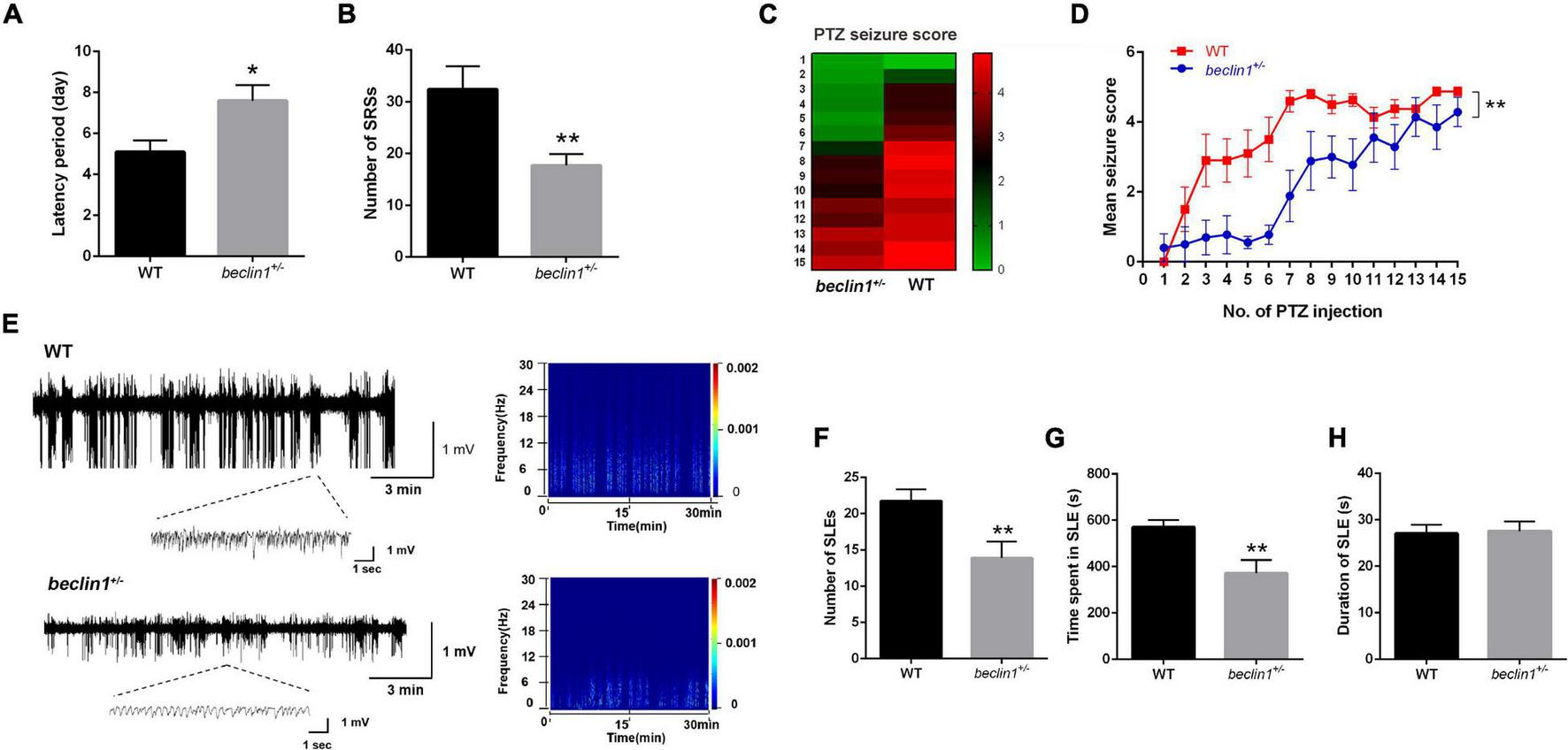 Knockdown of beclin1 decreased seizure susceptibility and epileptic activity. (A,B) Quantitative analysis of the spontaneous recurrent seizure (SRS) latency and total number of SRSs in the kainic acid (KA)-induced epilepsy model in the two groups (n = 10 mice per group). (C,D) Mean seizure scores recorded after the injection of pentylenetetrazol (PTZ) in the two groups on alternate days (n = 10 mice per group). (E) Representative traces of local field potentials (LFPs) from the wild-type (WT) and beclin1± groups. (F–H) Quantitative analysis of the number, time spent, and duration of seizure-like event (SLE) of the LFPs from two groups (n = 8 mice per group). Data are presented as the means ± SEM. *p < 0.05 and **p < 0.01. Group differences in the mean seizure score during PTZ kindling were evaluated with repeated-measures ANOVA. Student’s t-tests were performed.