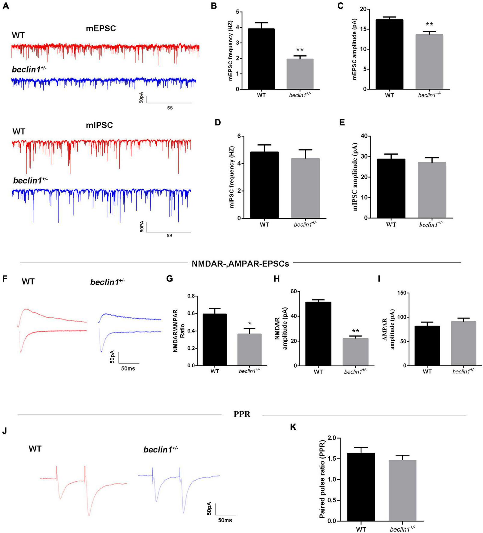 We then measured evoked EPSCs to investigate whether the altered excitatory synaptic transmission was caused by AMPAR-mediated or NMDAR-mediated currents (Figure 4F). We observed decreases in the NMDAR/AMPAR ratio (Figure 4G) and in the average amplitude of the NMDAR-mediated EPSCs (Figure 4H) from the beclin1± mice. However, AMPAR-mediated EPSCs were unchanged between the groups (Figure 4I). Alterations in NMDAR-mediated synaptic responses may occur presynaptically or postsynaptically. Therefore, the paired pulse ratios (PPRs) were recorded (Figure 4J), and no significant difference was observed between the two groups (Figure 4K). Taken together, these results indicate that beclin1 may modulate glutamatergic transmission through a postsynaptic mechanism rather than a presynaptic mechanism.
