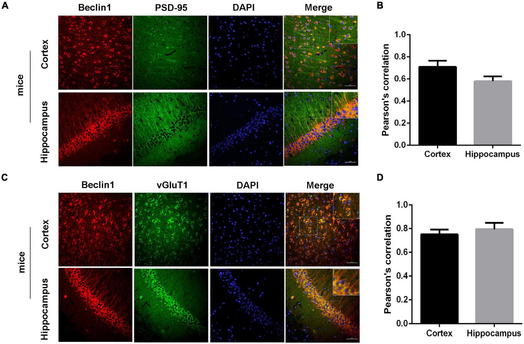 Then, we recorded mEPSCs and mIPSCs in neurons of the brain slices (Figure 4A). Compared with those of the WT group, both the amplitude and frequency of mEPSCs were decreased in the beclin1± group (Figures 4B,C), but significant differences in mIPSCs were not observed between the two groups (Figures 4D,E). Thus, beclin1 knockdown mainly affected excitatory synaptic transmission. We also identified the subcellular location of Beclin1 in mouse brain tissues to investigate this hypothesis. We immunostained neurons with antibodies against Beclin1 combined with antibodies against the excitatory postsynaptic membrane protein PSD-95 and the excitatory presynaptic membrane protein vGluT1 (Figure 5A) and vGluT1 (Figure 5C). The colocalization analysis suggested that Beclin1 was significantly correlated with PSD95 (Figure 5B) and vGluT1 (Figure 5D).