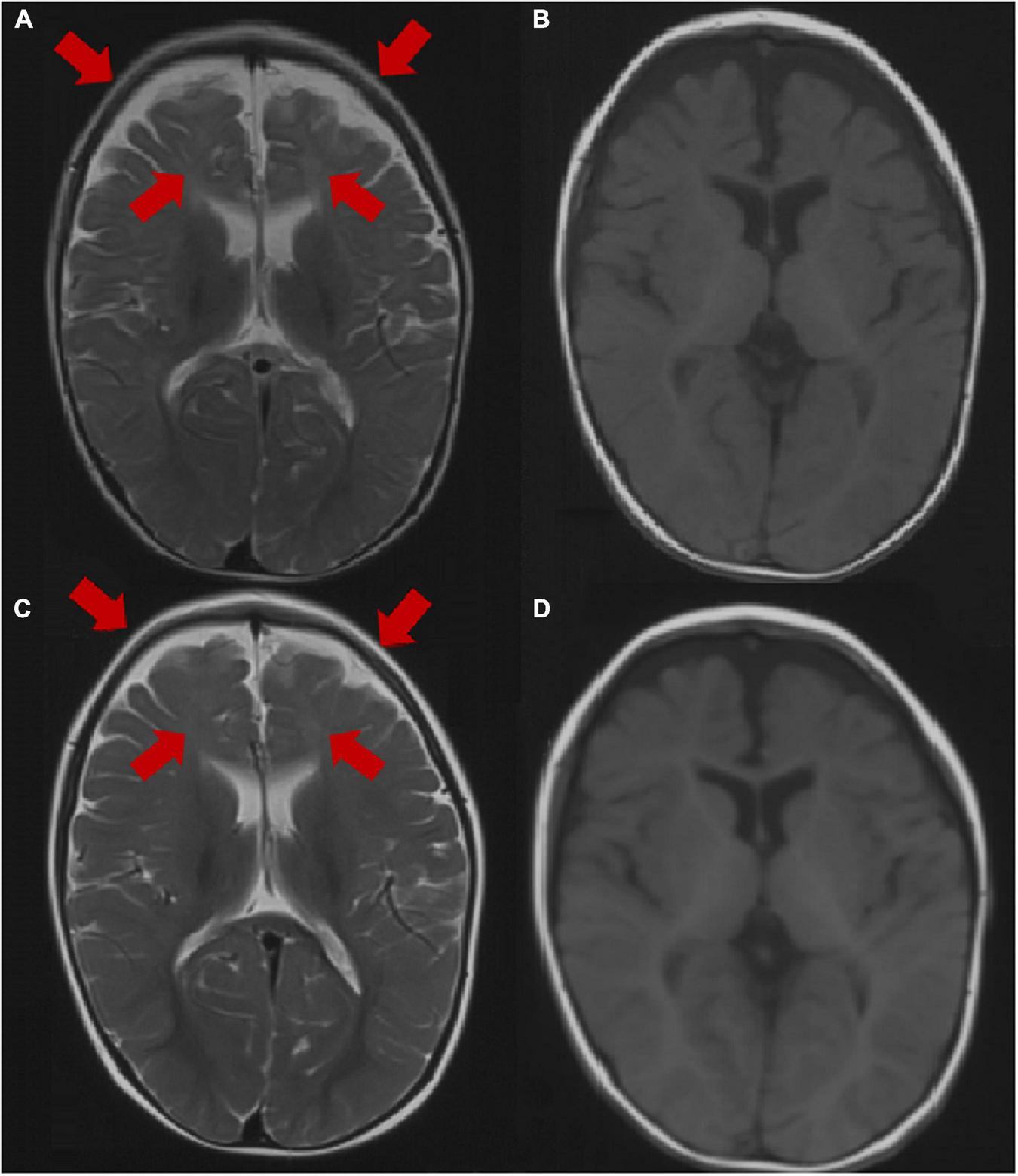 Brain MRI image of patient 3 at the age of 1 year. (A,B) Axial images (T1WI and T2WI) showing dysplasia of the frontal and temporal cortex and delayed myelination. Brain MRI image of patient 3 at the age of 2 years. (C,D) Axial images (T1WI, T2WI) showing dysplasia of the frontal cortex and delayed myelination. The arrow points to the lesion.
