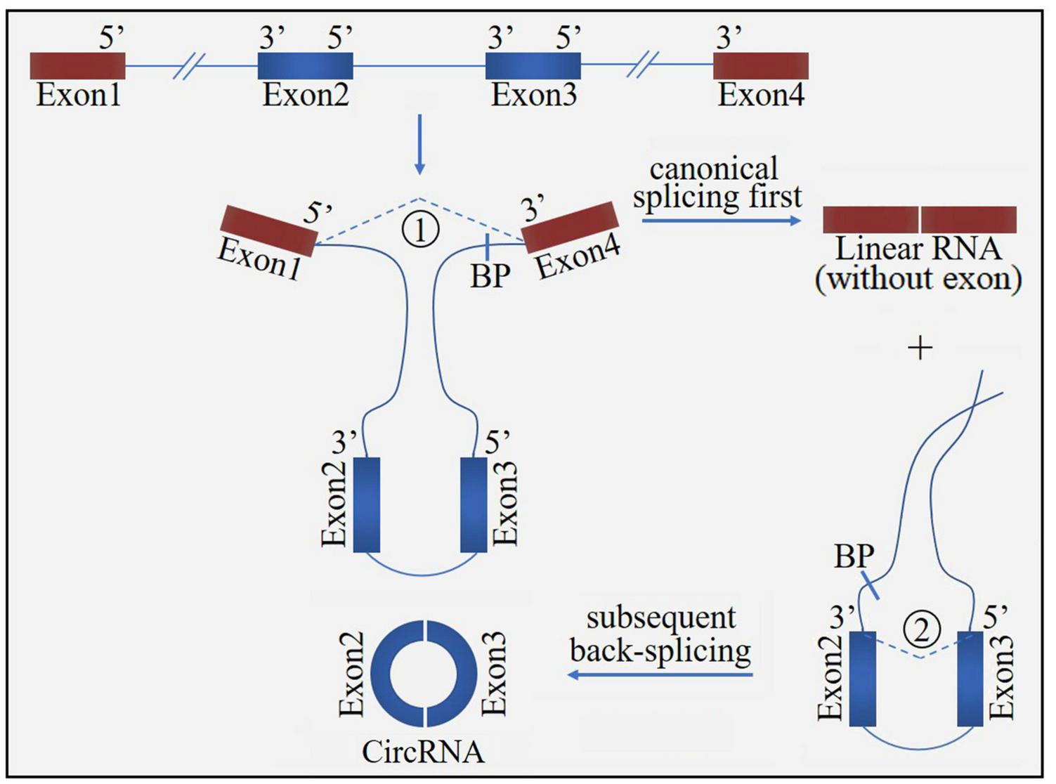 The “exon skipping” or “lariat intermediate” model for circRNA formation. The process starts with canonical splicing for a linear RNA (exon1 and exon4) with skipped exons (exon2 and exon3) and a long intron lariat containing these skipped exons, which is then further back-spliced to form a circRNA. BP, branchpoint.