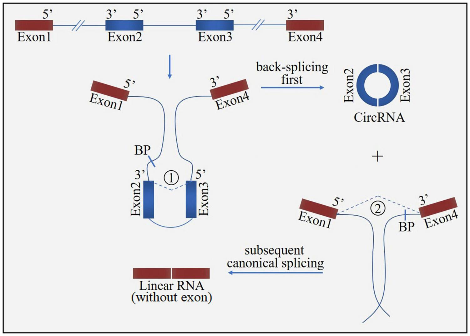 The “direct back-splicing” model for circRNA formation. The process starts with back-splicing for a circRNA (exon2 and exon3) together with an exon-introns-exon intermediate, which further form a linear RNA (exon1 and exon4) with skipped exons. BP, branchpoint.