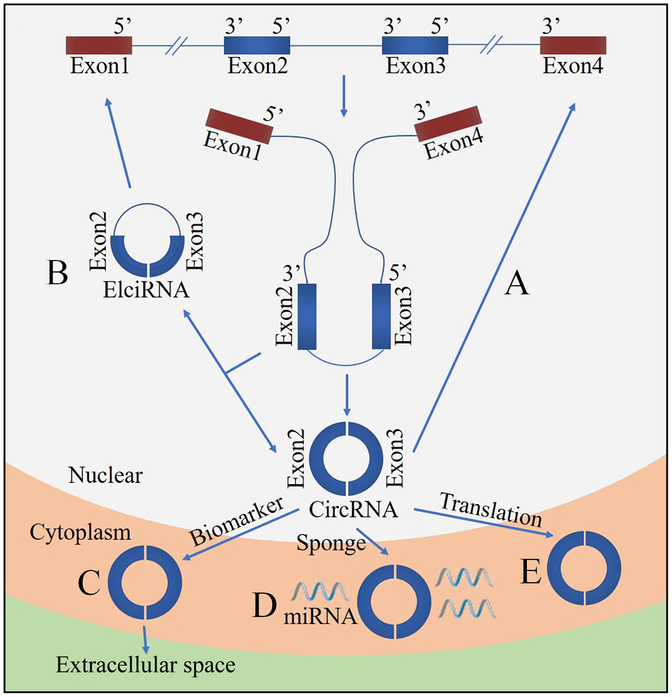 Functions of circRNA. (A) CircRNA can compete with the canonical splice of pre-mRNAs. (B) Nuclear localized circRNA can affect gene expression via exon intron circRNA (ElciRNA). (C) CircRNAs are promising biomarkers. (D) CircRNAs can act as sponges of miRNAs. (E) CircRNAs can be translated.