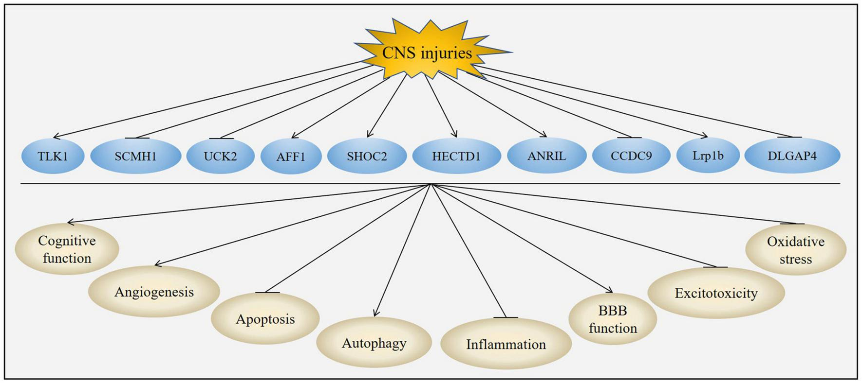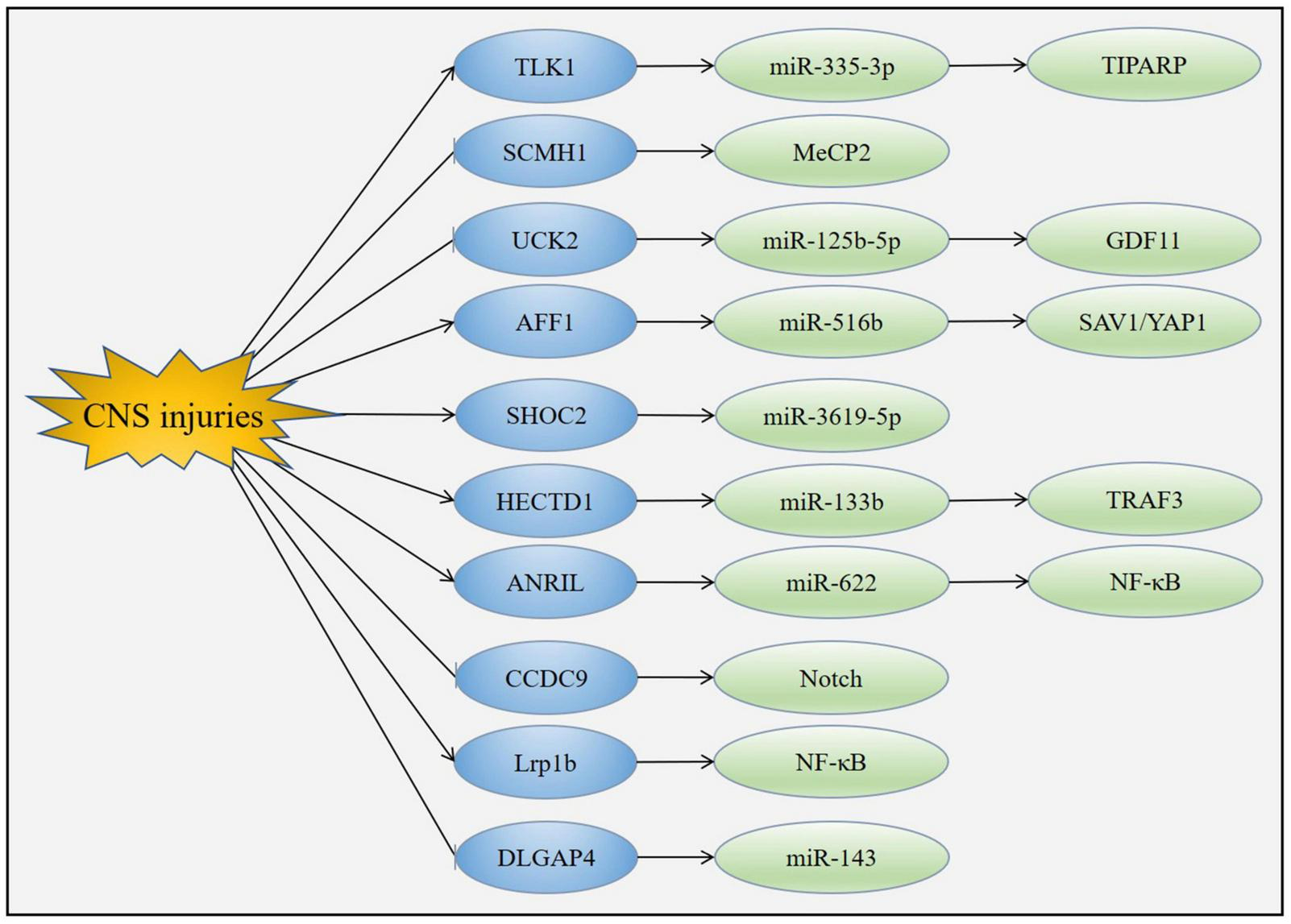 CNS, central nervous system; CircRNAs, circular ribonucleic acids; miRNA, microRNA; PHKA2, phosphorylase kinase alpha subunit; SOD2, superoxide dismutase-2; HBMEC, human brain microvascular endothelial cell; VEZF1, vascular endothelial zinc finger 1; TTC3, tetrapeptide repeat domain 3; TLR4, Toll-like Receptor 4; FoxO3, forkhead box O3; BBB, blood-brain barrier; mTORC1, mechanistic target of rapamycin complex 1; PHC3, polyhomeotic homolog 3; TRAF3, tumor necrosis factor receptor-associated factor 3; NEGR1, neuronal growth regulator 1; CDC14A, cell division cycle 14A; TET1, ten-eleven translocation-1; ORP150, 150-kDa oxygen-regulated protein; Map2k6, mitogen-activated protein kinase 6; SKA3, spindle and kinetochore associated complex subunit 3; MMP9, matrix metalloproteinase-9; HECTD1, HECT domain E3 ubiquitin ligase 1; TIPARP, TCDD-inducible poly-ADP-ribose polymerase; FUNDC1, FUN14 domain-containing 1; LAA, large artery atherosclerosis; SHOC2, Soc-2 suppressor of clear homolog; SIRT1, sirtuin1; HIPK2, homeodomain interacting protein kinase 2; UCK2, uridine-cytidine kinase 2; GDF11, growth differentiation factor 11; TLK1, tousled-like kinases 1; SCMH1, sex comb on midleg homolog-1; SCI, spinal cord injury; Usp10, ubiquitin-specific peptidase 10; CD84, HIPK3, homeodomain-interacting protein kinase 3; DPYSL5, dihydropyrimidinase like 5; Plek, pleckstrin; TGF-βR1, transforming growth factor-beta receptor 1; Prkcsh, protein kinase C substrate 80K-H; MEKK1, mitogen-activated protein kinase kinase 1; JNK, c-Jun N-terminal kinase; PI3K/AKT, phosphatidylinositol-4,5-bisphosphate 3-kinase/protein kinase B; NF-κB, nuclear factor kappa-light-chain-enhancer of activated B cells; NLRP3, NOD-, LRR-, and pyrin-domain containing protein 3; TBI, traumatic brain injury; Lrp1b, lipoprotein receptor-related protein 1b; Dram2, DNA-damage regulated autophagy modulator 2; Ptpn14, protein tyrosine phosphatase non-receptor type 14; ER, endoplasmic reticulum; 5-LOX, 5-lipoxygenase; SAH, subarachnoid hemorrhage; ARF3, ADP-ribosylation factor 3; MyD88, myeloid differentiation factor 88; AFF1, AF4/FMR2 family member 1; SAV1, Salvador 1; YAP1, Yes-associated protein 1.