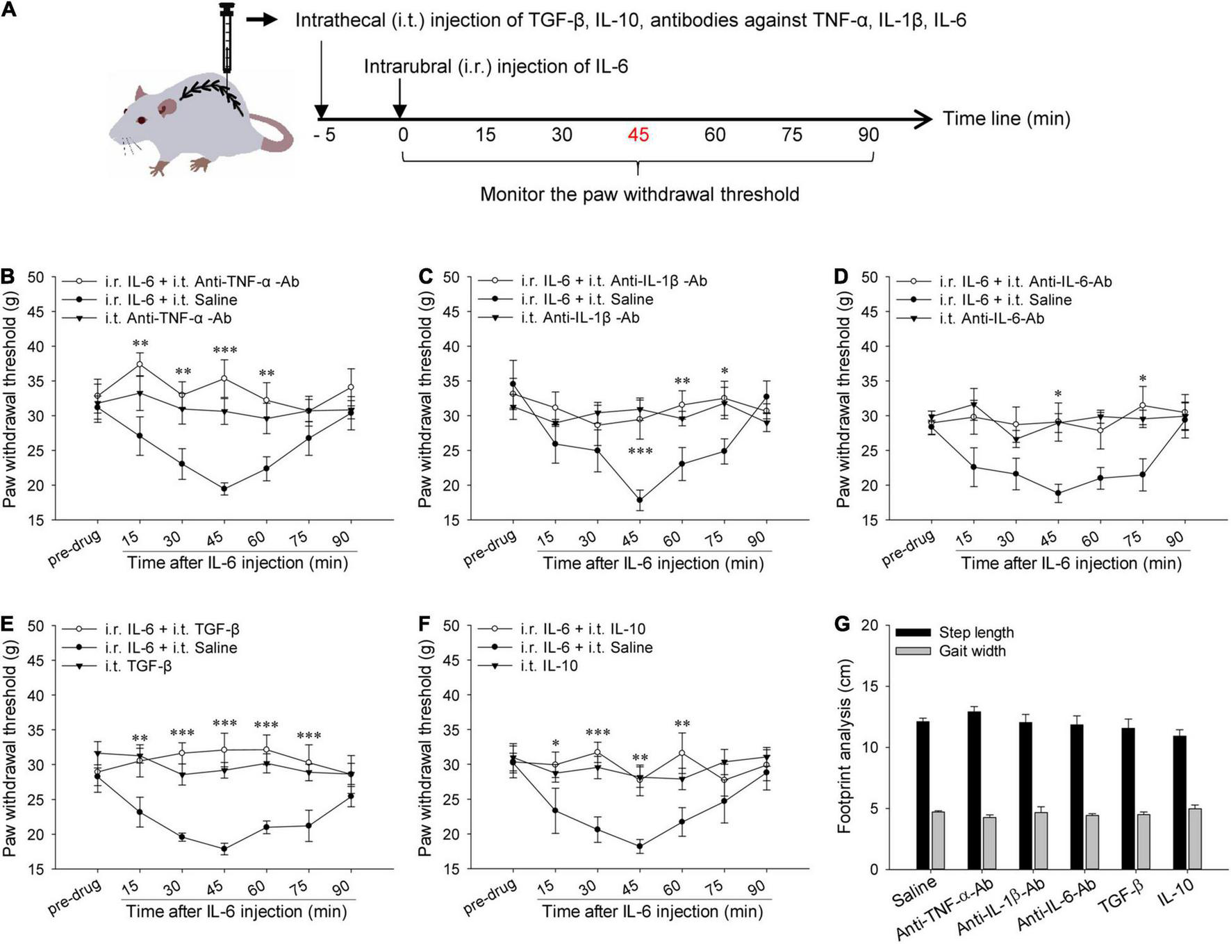 Actions of spinal pro-inflammatory and anti-inflammatory cytokines in rubral IL-6-evoked tactile allodynia. (A) Experimental schemes for studying the actions of spinal pro-inflammatory and anti-inflammatory cytokines in rubral IL-6-evoked tactile allodynia. (B–D) Intrathecal pre-injection of 2.0 μg anti-TNF-α-Ab, 1.0 μg anti-IL-1β-Ab, or 1.0 μg anti-IL-6-Ab alleviated rubral IL-6-evoked tactile allodynia compared to the normal saline (n = 7 rats/group). (E,F) Intrathecal pre-injection of 10 ng TGF-β or 300 ng IL-10 lessened rubral IL-6-evoked tactile allodynia compared with normal saline control (n = 7 rats/group). (G) Intrathecal injection of anti-TNF-α-Ab, anti-IL-1β-Ab, anti-IL-6-Ab, recombinant TGF-β, or IL-10 did not alter the locomotion of naive rats (n = 6 rats/group). *P < 0.05, **P < 0.01 and ***P < 0.001.