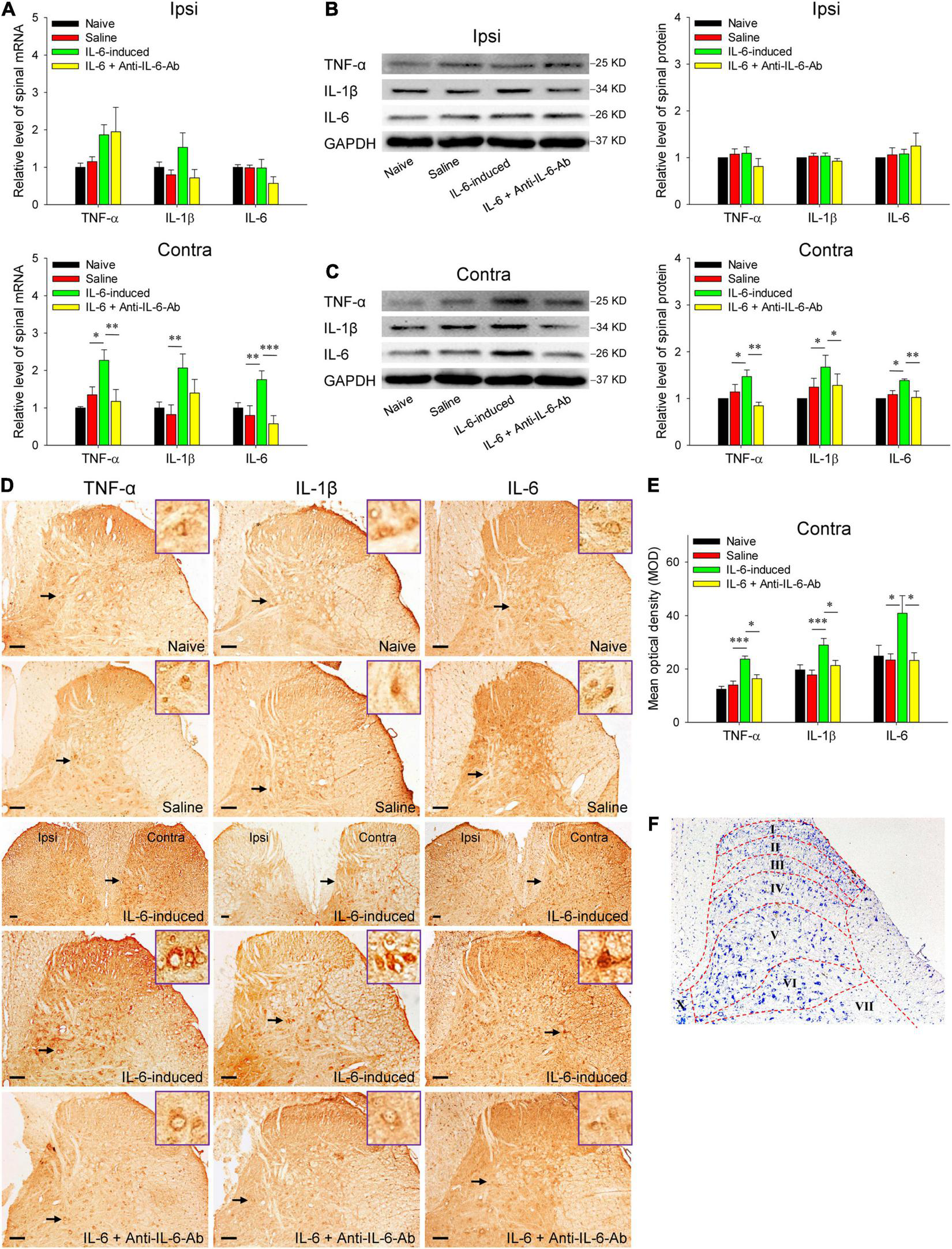Increased expressions of spinal TNF-α, IL-1β, and IL-6 in rubral IL-6-evoked tactile allodynia rats. (A) qRT-PCR showed that intrarubral injection of IL-6 significantly enhanced the mRNA levels of contralateral (but not ipsilateral) spinal TNF-α (n = 6 rats/group), IL-1β (n = 6–8 rats/group), and IL-6 (n = 6 rats/group) compared with normal saline control or IL-6 pre-neutralized with anti-IL-6-Ab control. (B,C) Western blotting showed that intrarubral injection of IL-6 significantly increased the protein expressions of contralateral (but not ipsilateral) spinal TNF-α, IL-1β, and IL-6 compared with normal saline or IL-6 pre-neutralized with anti-IL-6-Ab control (n = 6 rats/group). (D,E) Immunohistochemistry demonstrated that intrarubral injection of IL-6 increased the expressions of spinal TNF-α (n = 4–5 rats/group), IL-1β (n = 4 rats/group), and IL-6 (n = 4 rats/group) in the contralateral spinal dorsal horn (n = 4 rats/group). (F) Schematic diagram of the Rexed’s laminae of the spinal dorsal horn. *P < 0.05, **P < 0.01, and ***P < 0.001. Contra, contralateral to intrarubral injection of IL-6; Ipsi, ipsilateral to intrarubral injection of IL-6. Scale bars = 100 μm.