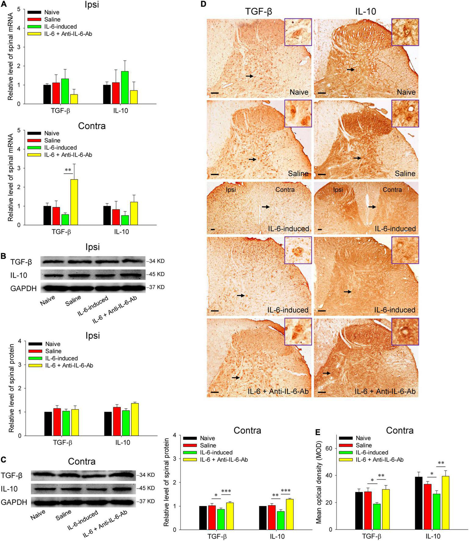 Decreased expressions of spinal TGF-β and IL-10 in rubral IL-6-evoked tactile allodynia rats. (A) qRT-PCR showed that intrarubral injection of IL-6 decreased the mRNA levels of contralateral (but not ipsilateral) spinal TGF-β (n = 6–8 rats/group) and IL-10 (n = 6–8 rats/group) compared with normal saline, although they did not show statistical significance. Administration of IL-6 pre-neutralized with anti-IL-6-Ab even significantly promoted the mRNA expression of spinal TGF-β. (B,C) Western blotting showed that intrarubral injection of IL-6 significantly decreased the protein expressions of contralateral (but not ipsilateral) spinal TGF-β and IL-10 compared with normal saline or IL-6 pre-neutralized with anti-IL-6-Ab control (n = 6 rats/group). (D,E) Immunohistochemistry exhibited that intrarubral injection of IL-6 decreased the expressions of spinal TGF-β (n = 4 rats/group) and IL-10 (n = 4 rats/group) in the contralateral spinal dorsal horn. *P < 0.05, **P < 0.01, and ***P < 0.001. Contra, contralateral to intrarubral injection of IL-6; Ipsi, ipsilateral to intrarubral injection of IL-6. Scale bars = 100 μm.