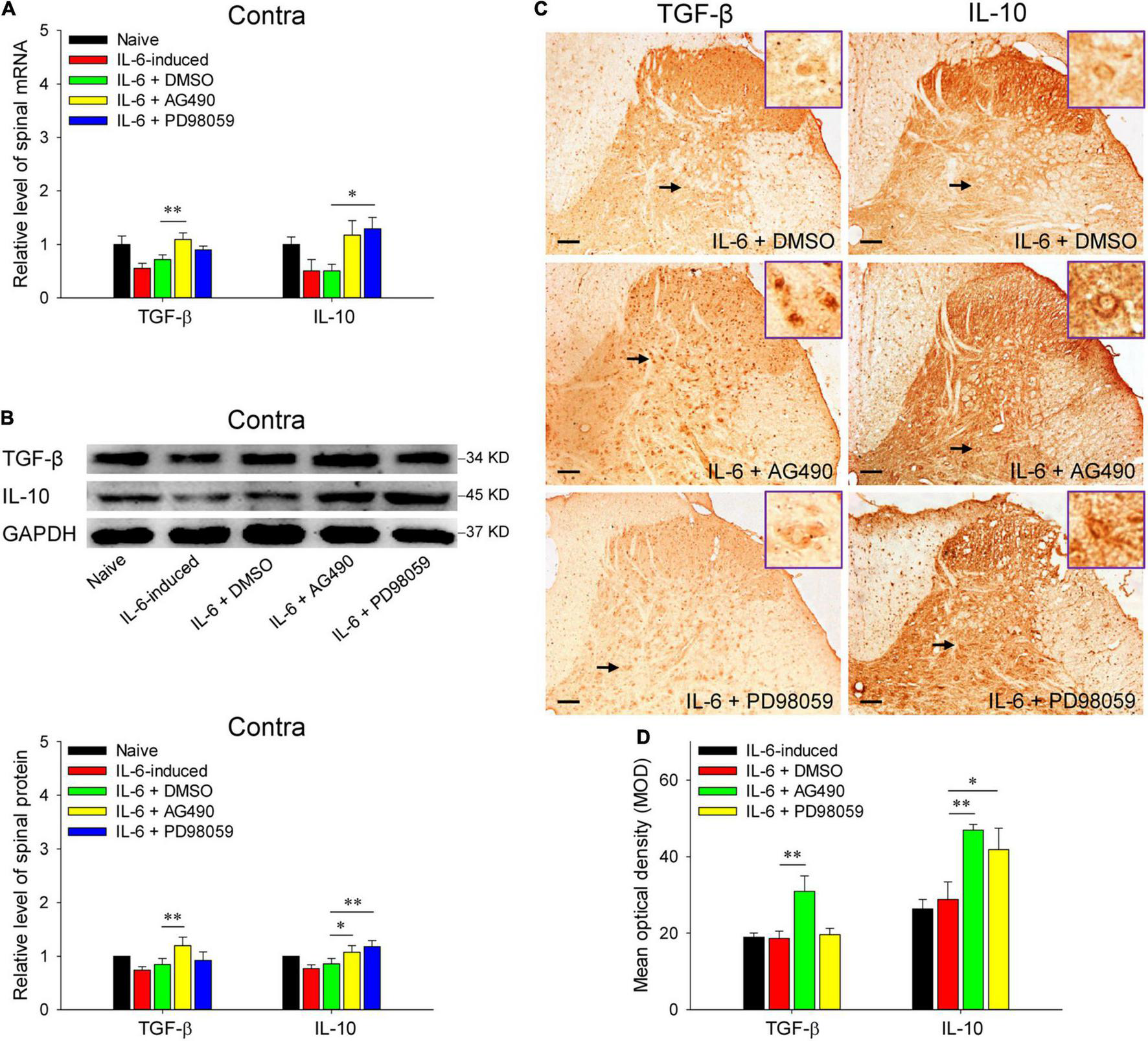 Red nucleus IL-6 inhibited the contralateral spinal TGF-β and IL-10 by activating JAK2/STAT3 and/or ERK pathways. (A) qRT-PCR showed that intrarubral pre-injection of JAK2/STAT3 inhibitor AG490 significantly promoted the mRNA expression of contralateral spinal TGF-β (n = 6–8 rats/group), while ERK inhibitor PD98059 significantly enhanced the mRNA expression of IL-10 (n = 6–8 rats/group) compared with DMSO control. (B) Western blotting showed that intrarubral pre-injection of JAK2/STAT3 inhibitor AG490 promoted the protein expressions of the contralateral spinal TGF-β and IL-10, but ERK inhibitor PD98059 only enhanced the protein expression of IL-10 compared with DMSO control (n = 6 rats/group). (C,D) Immunohistochemistry exhibited that intrarubral pre-injection of JAK2/STAT3 inhibitor AG490 promoted the protein expressions of spinal TGF-β (n = 4 rats/group) and IL-10 (n = 4 rats/group), and ERK inhibitor PD98059 enhanced the protein expression of IL-10 in the contralateral spinal dorsal horn. *P < 0.05 and **P < 0.01. Contra, contralateral to intrarubral injection of IL-6. Scale bars = 100 μm.