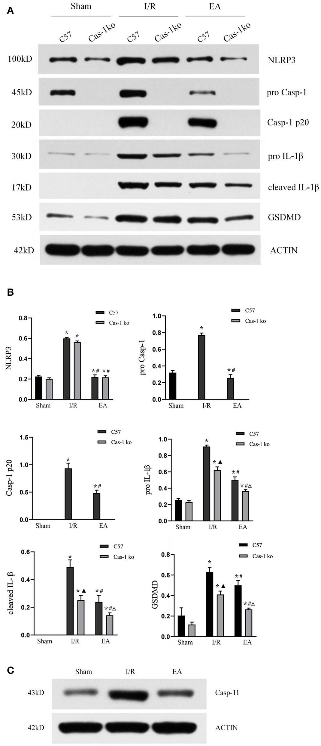 Protein expression of pyroptosis-related proteins. (A,B) Western blotting analysis of NLRP3, pro-Casp-1, Casp-1 p20, IL-1β, cleaved IL-1β, and GSDMD in different treatment groups and quantitative analysis of bands. (C) Western blotting analysis of casp-11 in Cas-1 ko mice. Comparison within the same genotype: *p < 0.05 vs. Sham group; #p < 0.05 vs. I/R group. Comparison within the I/R group: ▴p < 0.05 vs. C57 mice. Comparison within the EA group: Δp < 0.05 vs. C57 mice. Data are representative of two (C) or four independent experiments [(A,B) mean ± SD are representative of values from four independent experiments in (B)].