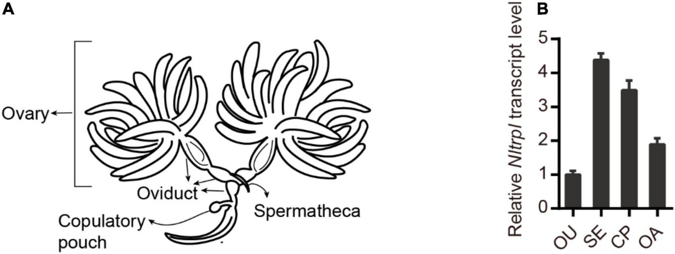 Figure 2. Expression patterns of Nltrpl in the female reproductive organ. (A) A diagram showing the reproductive organ of female brown planthoppers. (B) Expression patterns of Nltrpl in the four female reproductive organ regions: oviduct (OU), spermatheca (SE), copulatory pouch (CP), and ovary (OA). Data are expressed as mean ± SEM.