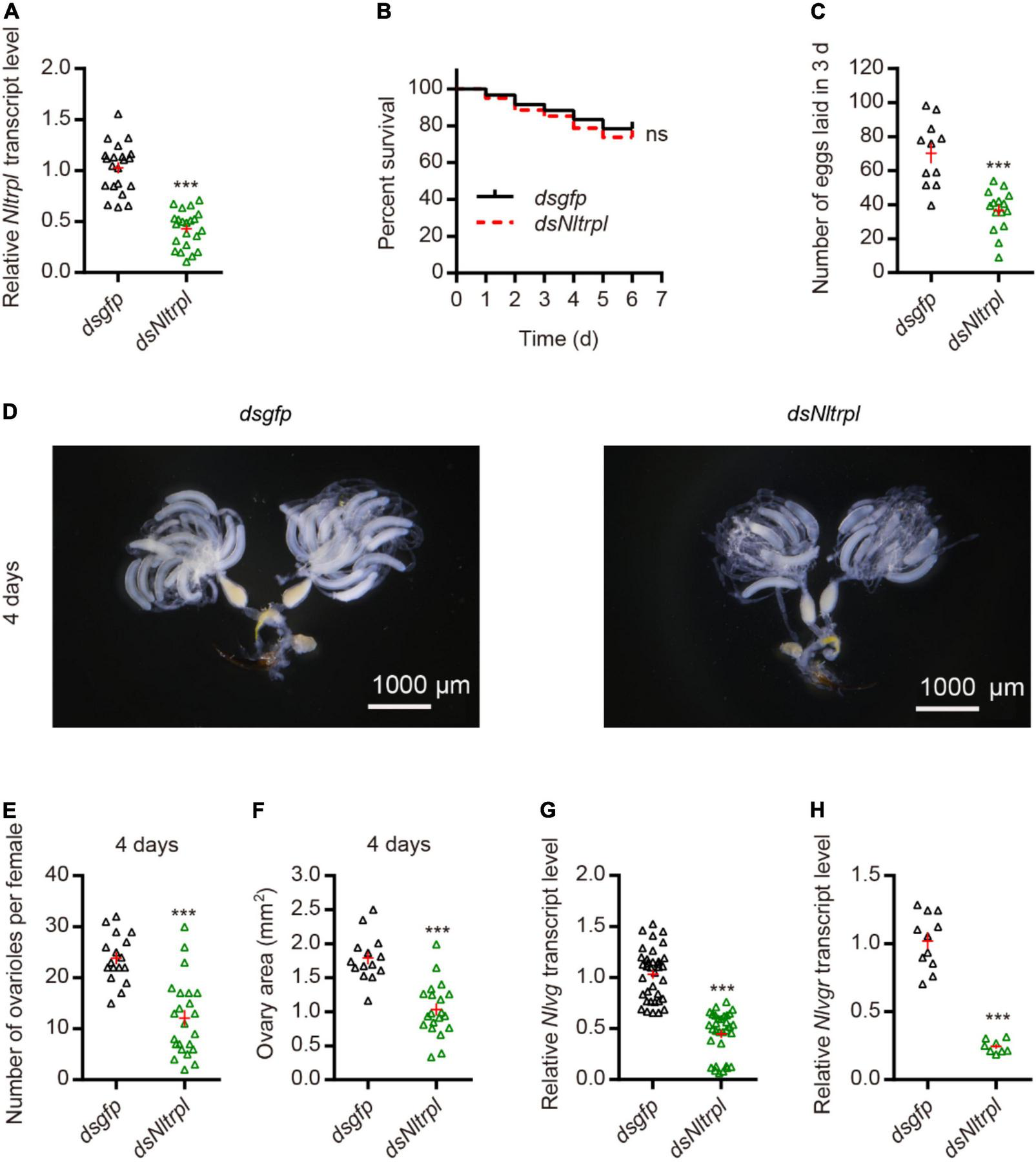 Figure 3. Knockdown of Nltrpl in the brown planthopper (BPH) impaired egg-laying behavior. (A) Downregulation of Nltrpl in BPH using dsNltrpl reduced mRNA expression levels compared to BPH injected with dsgfp. (B) Survival rate of BPH injected with dsgfp (n = 60) and dsNltrpl (n = 60). Survival analyses with log-rank test: χ2 = 0.3669, not significant (ns). (C) Number of eggs laid during the 3 days after dsgfp or dsNltrpl injection. Underdeveloped ovaries (D) and detained eggs per ovary (E) per female 4 days after injection of dsgfp or dsNltrpl. (F) Ovary area in per female 4 days after injected with dsgfp or dsNltrpl. mRNA expression level of BPH vitellogenin gene [Nlvg; (G)] and vitellogenin receptor gene [Nlvgr; (H)] after injection with dsgfp or dsNltrpl. ***P < 0.001, Student’s t-test.