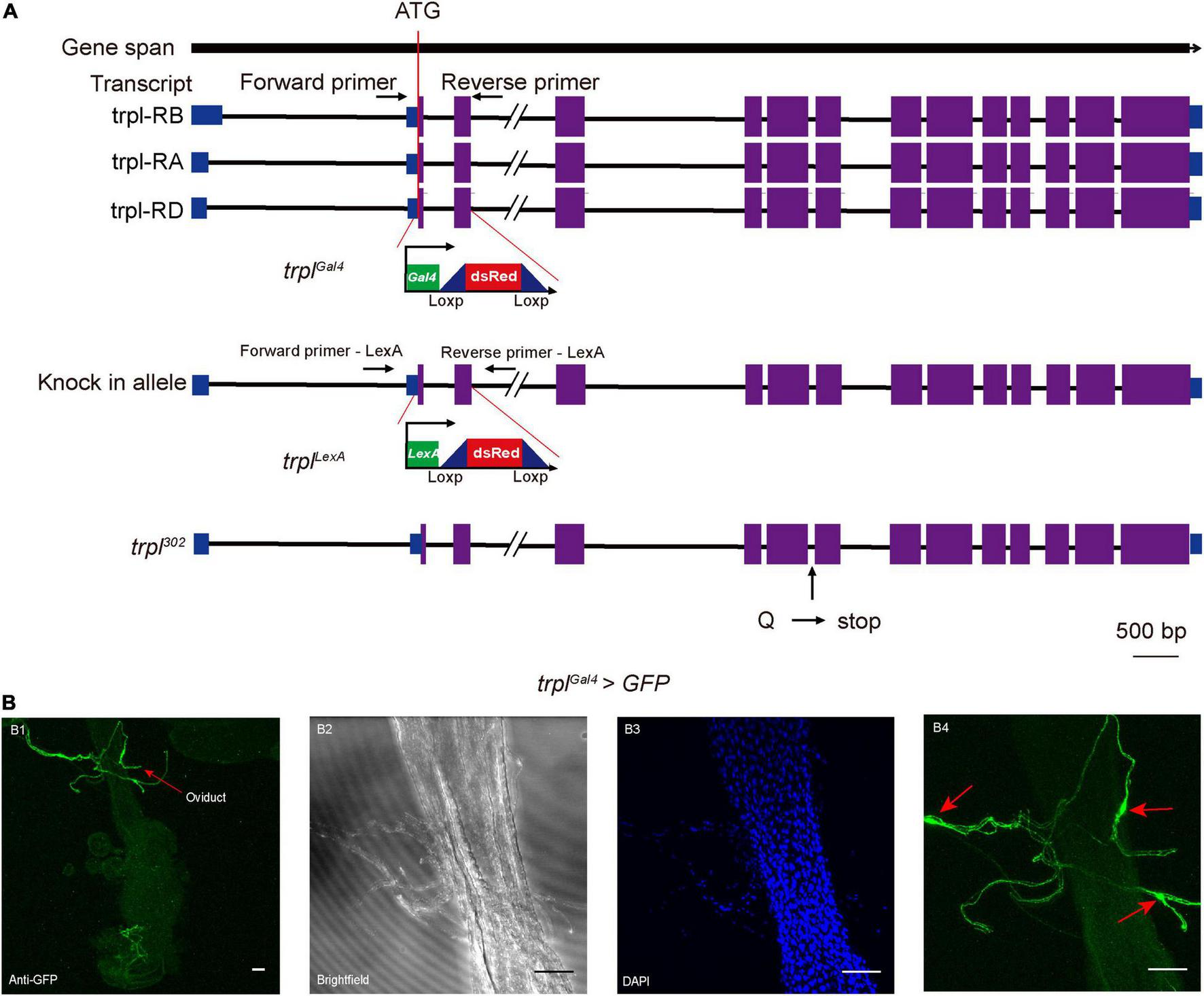 Figure 4. Expression patterns of TRPL on the reproductive organ of female Drosophila. (A) Generation of the trpl reporter and mutant alleles. (B) Expression of UAS-mCD8-GFP in sensory neurons innervating the female oviduct under control of trplGal4 (trpl > mCD8-GFP) (B1–B4). Arrows in (B1,B4) indicate the somas of sensory neurons. Scale bars, 50 μm.