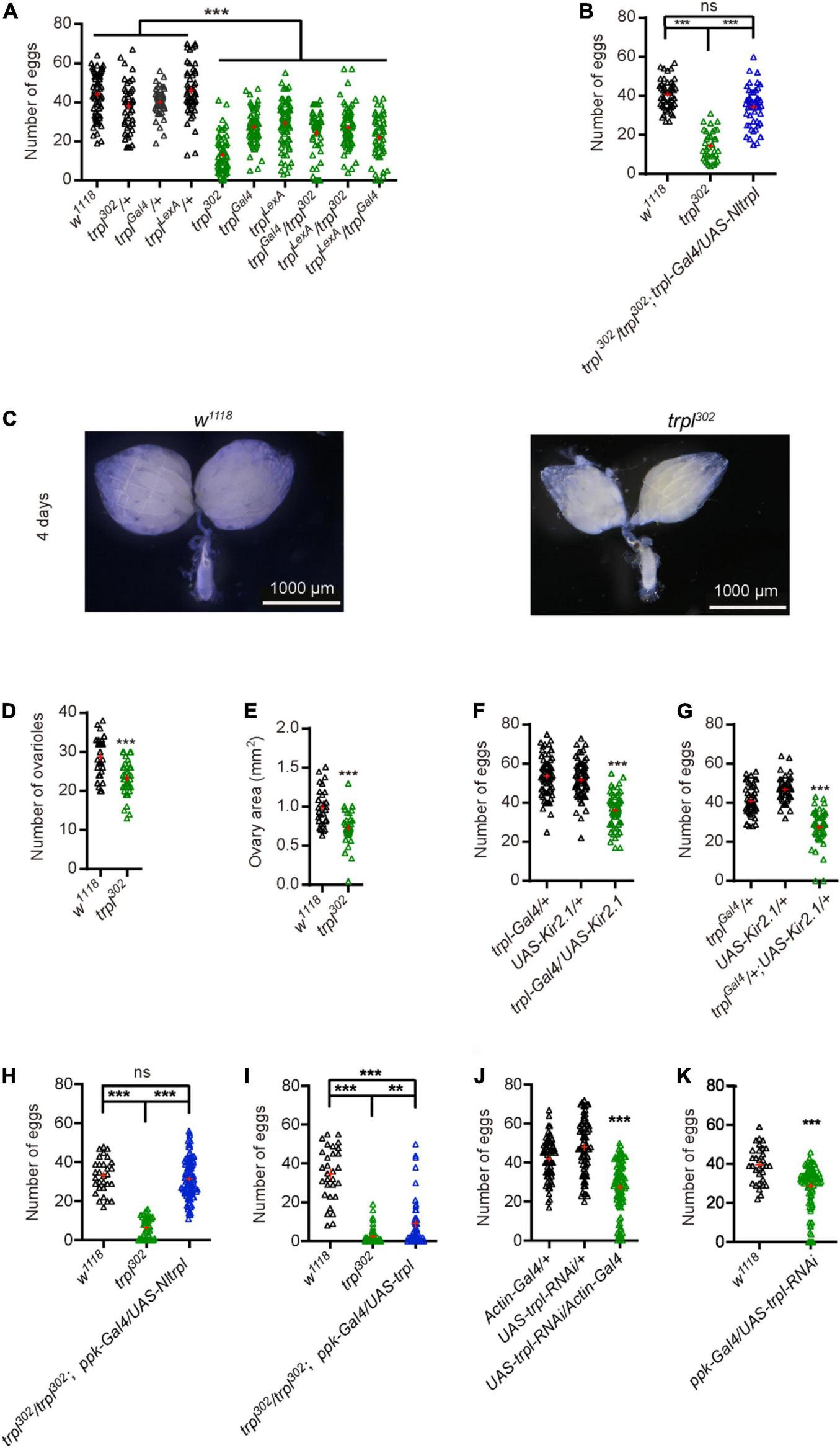 Figure 5. Transient receptor potential-like (trpl) is essential for fruit fly egg-laying behavior. (A) Numbers of eggs laid by wild-type and trpl mutant flies. (B) The trpl mutants were rescued by expressing Nltrpl. (C) Ovary development of wild-type (w1118) and trpl302 mutants 4 days after eclosion. Ovariole number (D) and ovary area (E) in wild-type and mutant files. Number of eggs was reduced after trpl-expressing neurons were inhibited using Kir2.1 via trpl-Gal4 (F) or trplGal4 (G). (H,I) Rescue of trpl mutants with a ppk-Gal4 that expressed in oviduct neurons. (J) Number of eggs from controls and mutant flies in which trpl is globally knocked down. (K) Number of eggs from wild type and mutant flies with trpl selectively knocked down in oviduct sensory neurons. ***P < 0.001, one-way ANOVA with Tukey’s multiple comparisons test.