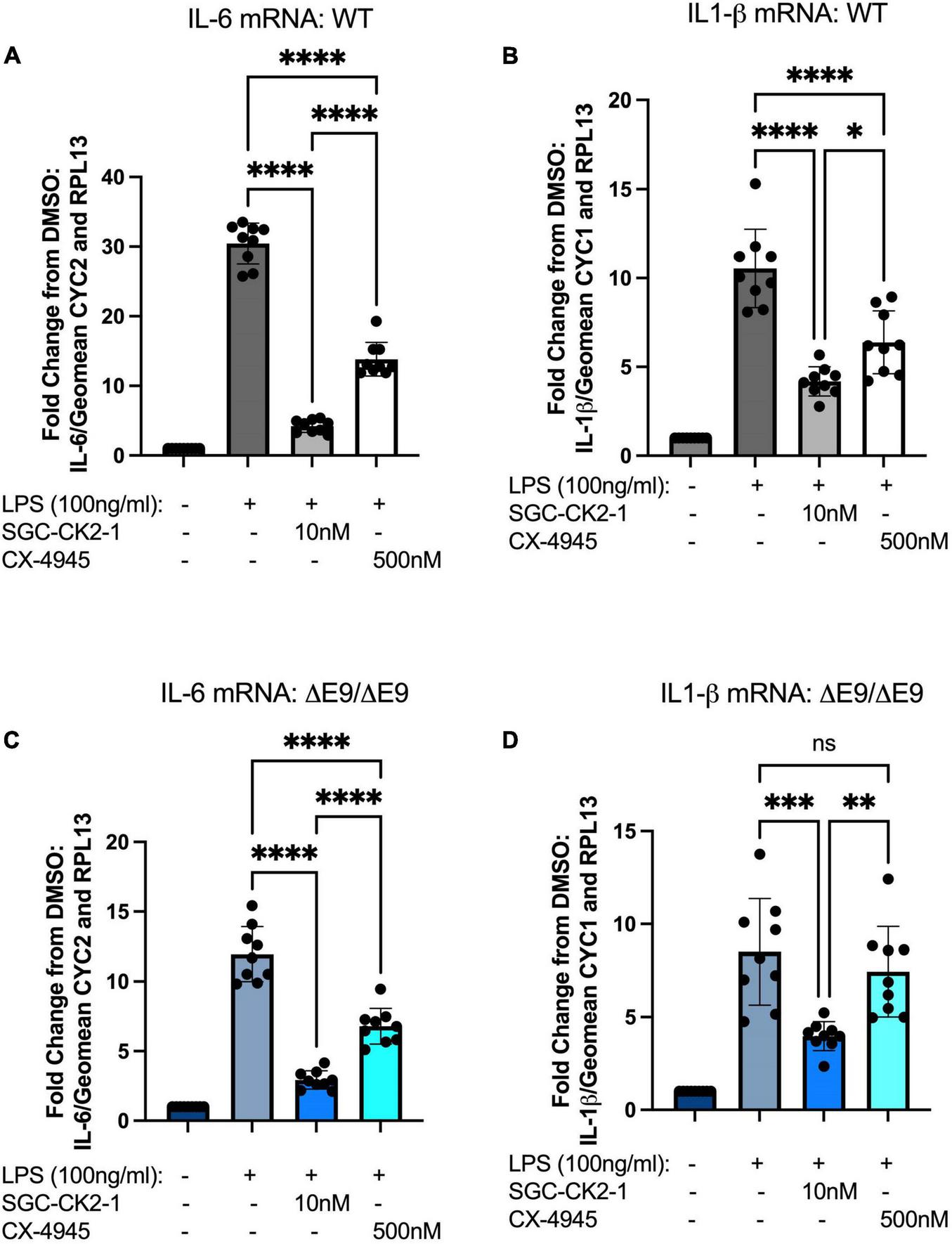 SGC-CK2-1 is more effective at inhibiting mRNA expression of IL-6 and IL1-β in hiPSC-MGLs after LPS stimulation than CX-4945. WT (A,B) and FAD (C,D) MGLs were stimulated with LPS and simultaneously treated with either SGC-CK2-1 or CX-4945 for 24 h. In all conditions, SGC-CK2-1 was more effective at inhibiting both IL-6 and IL1-β mRNA than CX-4945. These data represent three independent differentiations. ****p ≤ 0.0001; ***p = 0.0006; **p = 0.0077; *p = 0.0293; ns, not significant by one-way ANOVA analysis. Error bars indicate the mean ± SD.