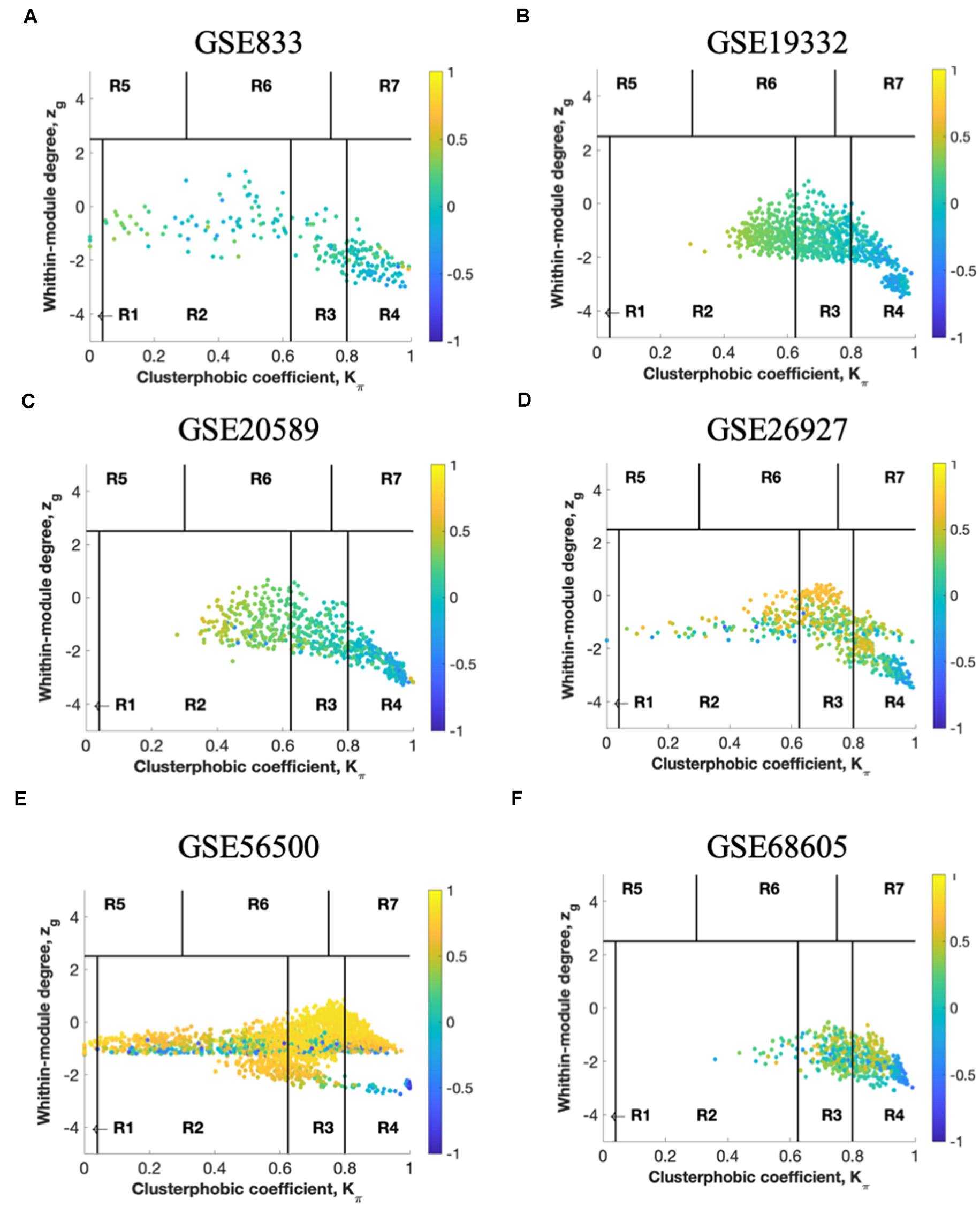 The panels (A–F) represent the results for GSE833, GSE19332, GSE20589, GSE26927, GSE56500, and GSE68605, respectively. Heat cartography map with nodes colored by their average Pearson Correlation Coefficient (APCC) value. Yellow nodes are party and date hubs, which are positively correlated in expression with their interaction partners. Blue nodes are the fight-club hubs, with an average negative correlation in expression with their interaction partners. Blue nodes falling in the region R4 are the switch genes characterized by low Zg and high Kπ values and are connected mainly outside their module. Thus, region R4 represents the switch genes.