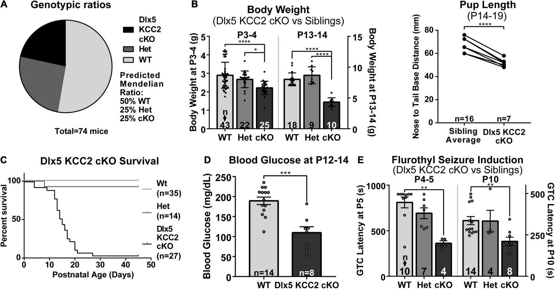 Dlx5 KCC2 cKO mice exhibit failure to thrive and seizures. (A–C) Graphs showing that Dlx5 KCC2 cKO pups are born at expected 25% Mendelian ratio (A), but have decreased weight and length (B), and die in the postnatal period (C). One-way ANOVA with Sidak’s multiple comparisons: *P < 0.05, ****P < 0.0001. For body length, paired comparisons against an average of matched littermate lengths were done using a ratio paired T-test, ****P < 0.0001. (D) Mild hypoglycemia in Dlx5 KCC2 cKO pups. T-test: ***P < 0.001. (E) Susceptibility of Dlx5 KCC2 cKO pups to faster onset of flurothyl-induced generalized tonic clonic seizures (GTC) at P4–P5 and P10. Kruskal–Wallis non-parametric ANOVA: **P < 0.01. The number of mice examined is indicated by n values in each panel. For bar graphs, these are listed at the bottom of each bar.