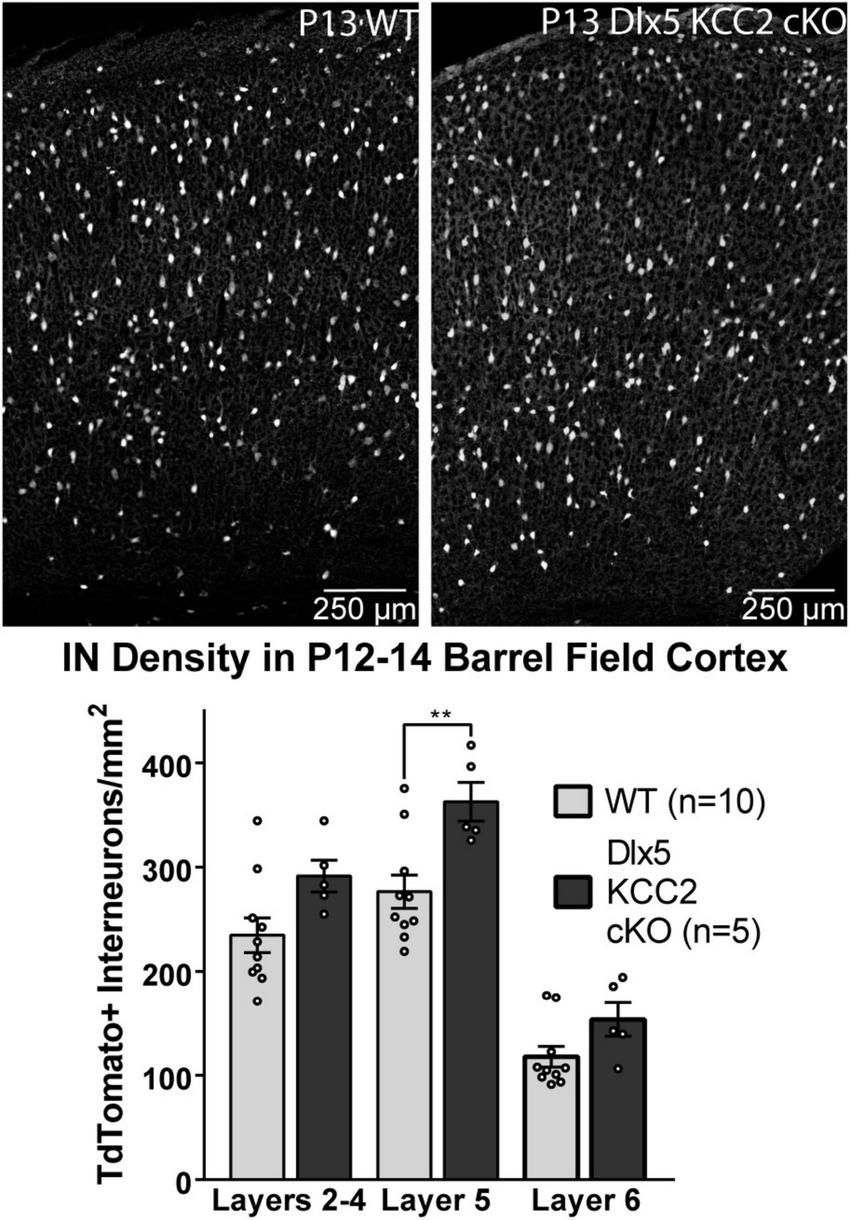 Increase in Layer 5 INs in P12–14 Dlx5 KCC2 cKO Cortex. Bar graph shows densities of INs, labeled by cre reporter, by different layers of barrel field cortex in P12–14 WT, heterozygote, and Dlx5 KCC2 cKO. Images show examples of IN reporter expression in WT and Dlx5 KCC2 cKO cortex. One-way ANOVA with Sidak’s multiple comparisons: **P < 0.01. n = 10 WT, 5 Dlx5 KCC2 cKO mice.