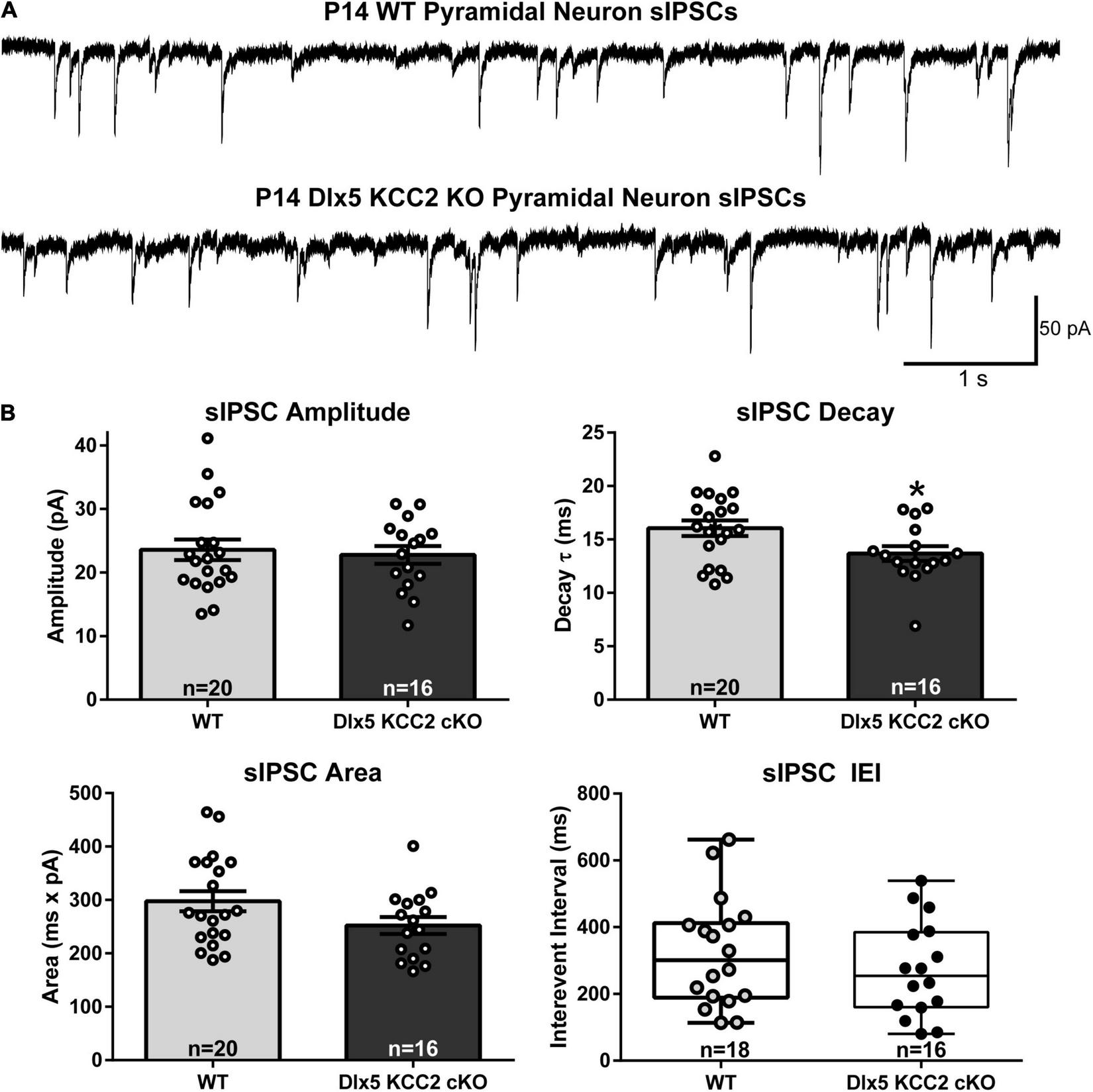 Normal sIPSC frequency, faster decay in pyramidal neurons in KO. (A) Sample recordings of spontaneous IPSCs in layer 5 pyramidal neurons in barrel cortex of P12–14 WT and Dlx5 KCC2 cKO. (B) Amplitude, area, decay (mean ± SEM), and inter-event interval (IEI, box and whisker plot showing median, 25/75 percentile, and maximum/minimum) of spontaneous IPSCs in layer 5 pyramidal neurons in barrel cortex of P12–14 WT and Dlx5 KCC2 cKO. T-test: *P < 0.05. Non-parametric Mann–Whitney test was used for IEI only. n values at the bottom of each bar/box and whisker plot indicate the number of cells recorded, taken from ≥5 mice, for each group.