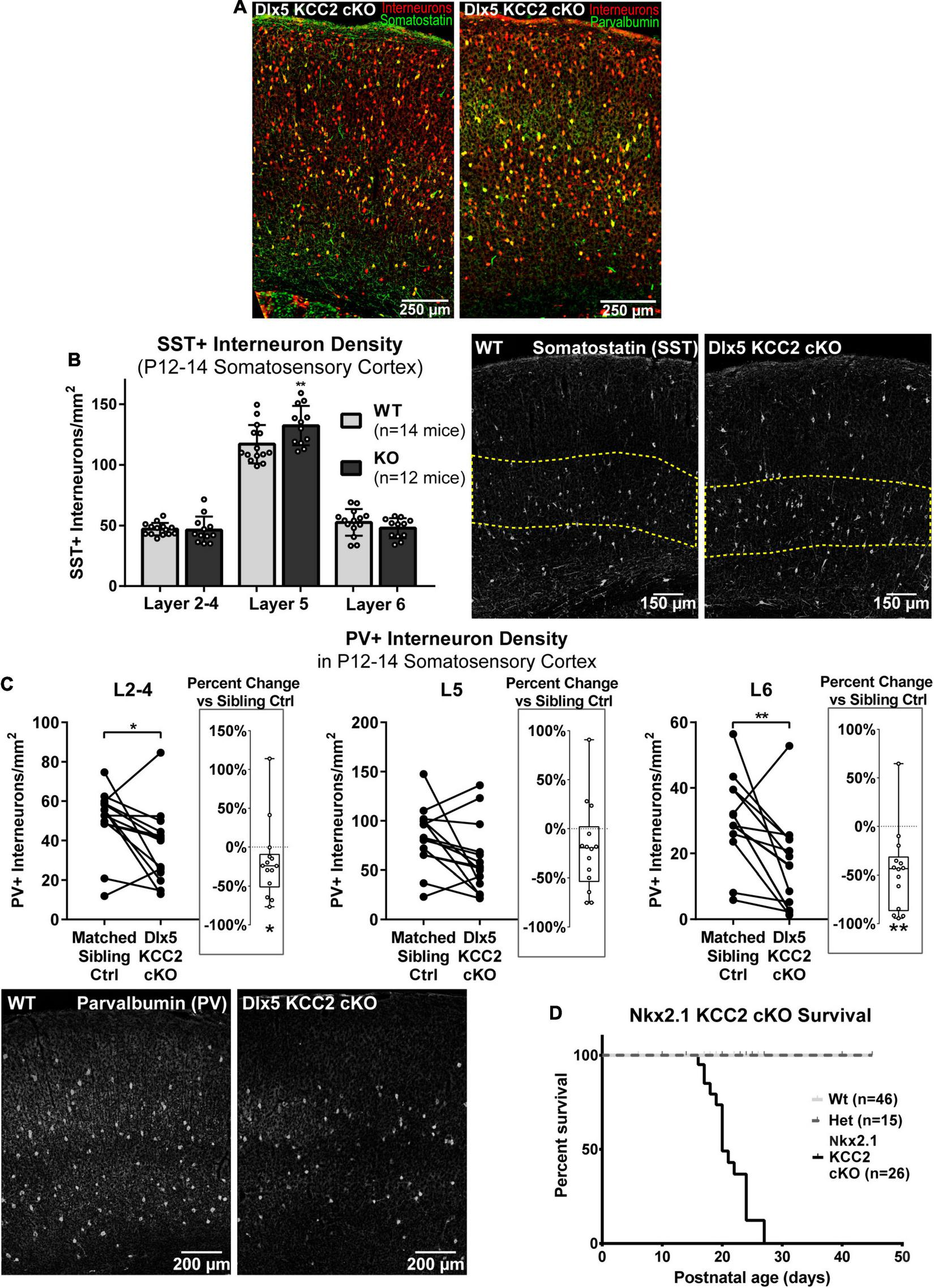 Altered distribution of somatostatin and parvalbumin INs in maturing cortex of Dlx5 KCC2 cKO. (A) Images showing complete co-localization of SST (left, green) and PV (right, green) immunopositive neurons with Ai14 cre reporter used to label INs (red) in P13 barrel field cortex. (B) Average density with SEM of SST+ cells in different layers of P12–14 somatosensory cortex with exemplary images of SST immunolabeling. Yellow dashed line demarcates layer 5. n = 14 WT, 12 Dlx5 KCC2 cKO mice. One-way ANOVA with Sidak’s multiple comparisons: **P < 0.01. (C) Paired comparisons of density of PV+ cells in layers 2–4 (L2–4), 5 (L5), and 6 (L6) in P12–14 somatosensory cortex of Dlx5 KCC2 cKO and control littermates, with exemplary images of PV immunolabeling. Box and whisker plots in each graph plot percent difference change in each littermate pair, n = 12 littermate mouse pairs. Wilcoxon matched-pairs signed rank test, **P < 0.01, *P < 0.05. (D) Survival plot of Nkx2.1 KCC2 knockout, conditional only to PV and SST INs. n = 46 WT, 15 heterozygote, 26 Nkx2.1 KCC2 knockout mice.
