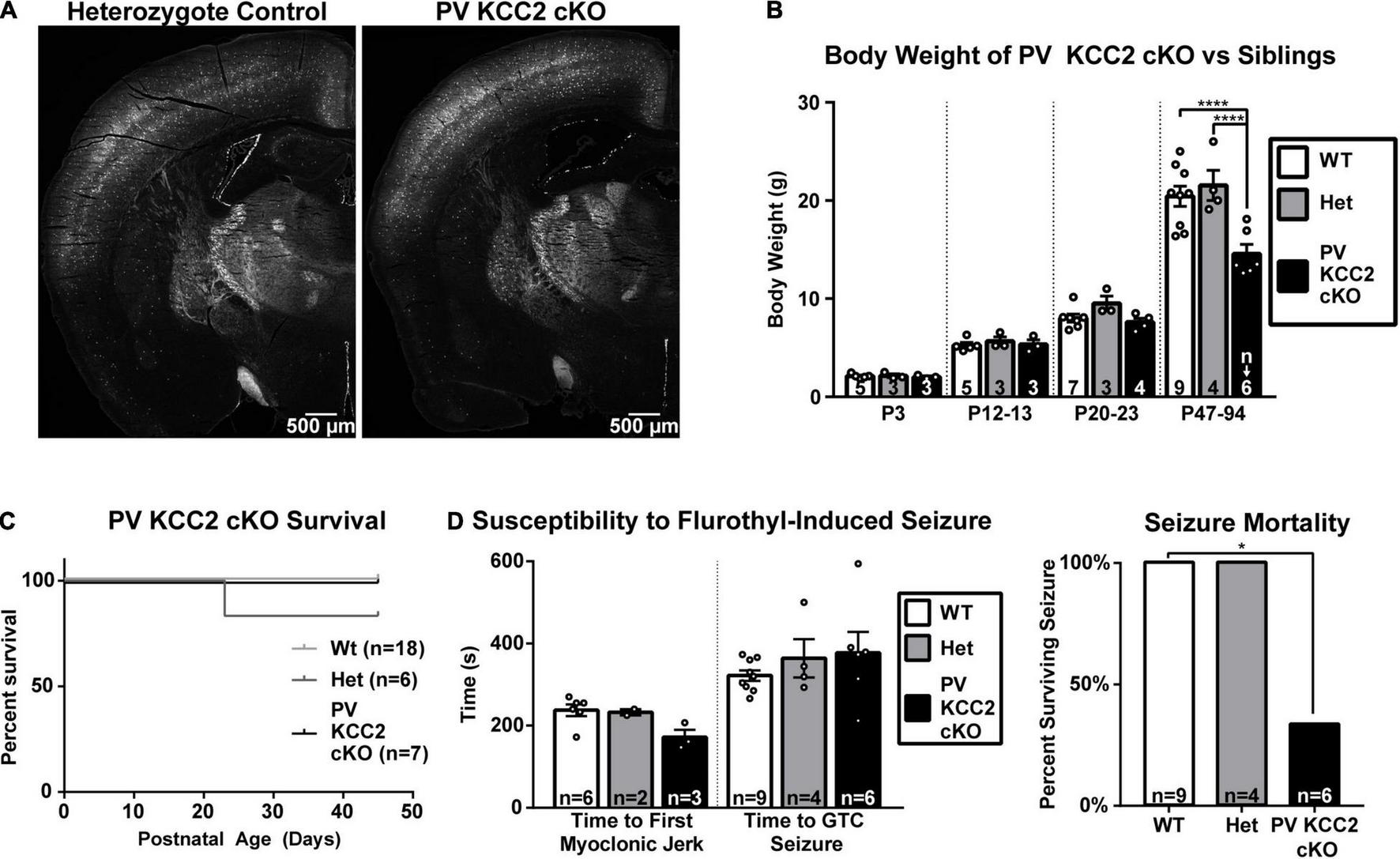 Selective loss of KCC2 in parvalbumin neurons does not cause seizure susceptibility nor failure to thrive. (A) PV INs labeled by Ai14 cre reporter in hemisections of P64 PV KCC2 cKO and sibling control. (B) Body weight of PV KCC2 cKO. One-way ANOVA with Sidak’s multiple comparisons: ****P < 0.0001. Note normal PV KCC2 cKO body weight until adulthood, when it is slightly diminished. (C) Postnatal survival is unaffected in PV KCC2 cKO. (D) Seizure susceptibility (right) measured by time to first myoclonic jerk and generalized tonic clonic seizure (left) and seizure mortality (right) resulting from flurothyl seizure induction in PV KCC2 cKO mice. Note that PV KCC2 cKO do not exhibit faster onset of induced seizures, but are highly likely to die from them. Chi squared with Yates’ correction: *P < 0.05. The number of mice examined is indicated by n values in each panel. For bar graphs, these are listed at the bottom of each bar.