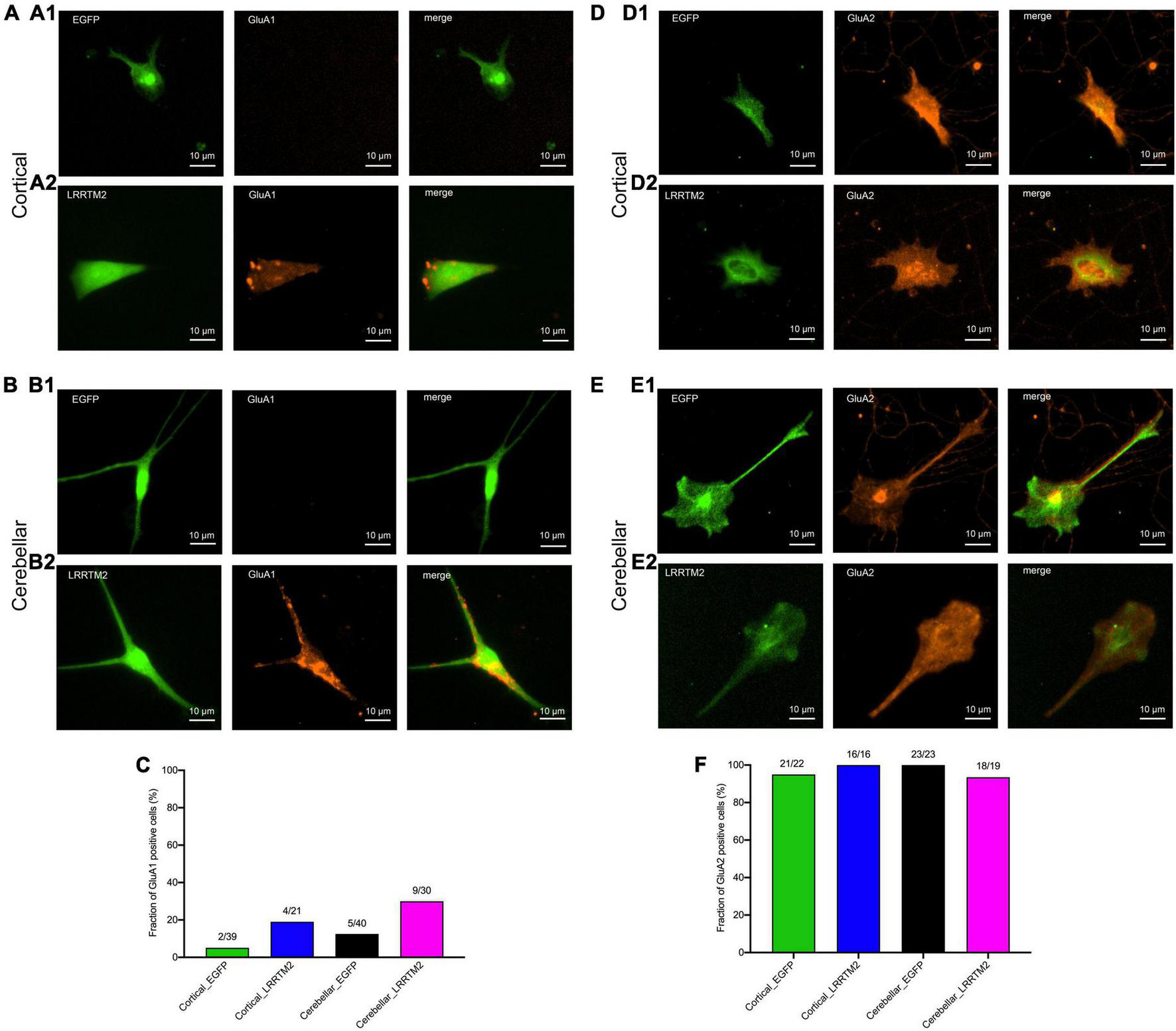 Effects of LRRTM2 expression on AMPA receptor subunit GluA1 and GluA2 expression in immature cortical and cerebellar astrocytes contacted by explant axons. (A,B) Fluorescence images of transfected astrocytes (EGFP (control) and LRRTM2 + EGFP, green) and immunostainings for GluA1 (red) in immature cortical astrocytes (A1,A2) and in cerebellar astrocytes (B1,B2). Scale bars: 10 μm. (C) Quantification of the fraction of GluA1 positive astrocytes. (D,E) Fluorescence images of transfected astrocytes (EGFP (control) and LRRTM2 + EGFP, green) and immunostainings for GluA2 (red) in immature cortical astrocytes (D1,D2) and in cerebellar astrocytes (E1,E2). (F) Quantification of the fraction of GluA2 positive astrocytes.