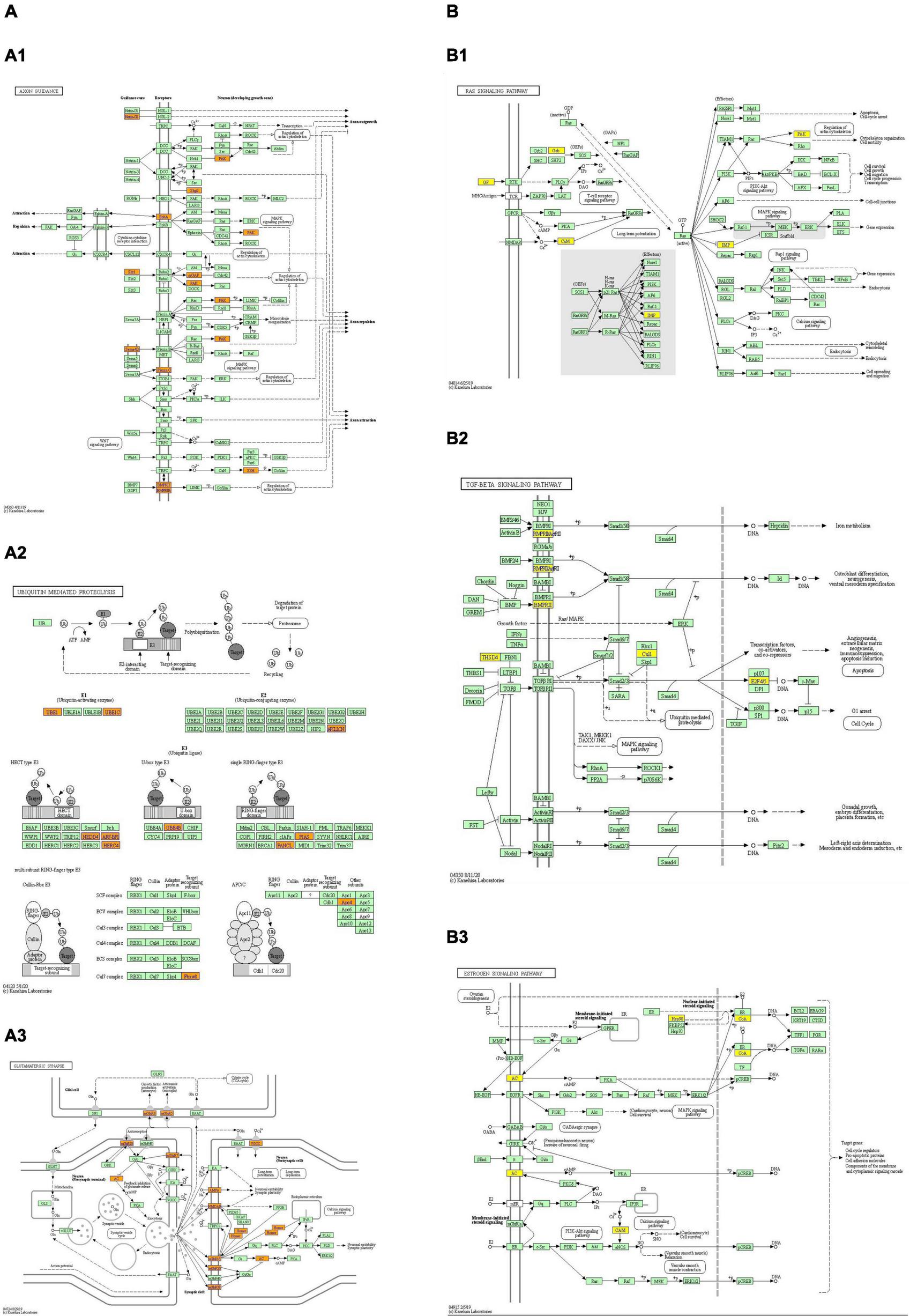 Gene Ontology (GO) and Kyoto Encyclopedia of Genes and Genomes (KEGG) analyses for upregulated and downregulated (A,B) circRNAs. (A1,B1) Classification of the GO analysis predicted biological processes. (A2,B2) Top 10 significantly enriched genes based on their fold enrichment scores. (A3,B3) KEGG pathway analysis showing the top 10 significantly enriched pathways and their scores. (A4,B4) GO analysis predictions in cellular component and molecular function. GO gene ontology; Sig, significantly; BP, biological processes. Selection counts, count of the genes’ entities directly associated with the listed pathway ID; Selection Size, the total number of the genes’ entities.