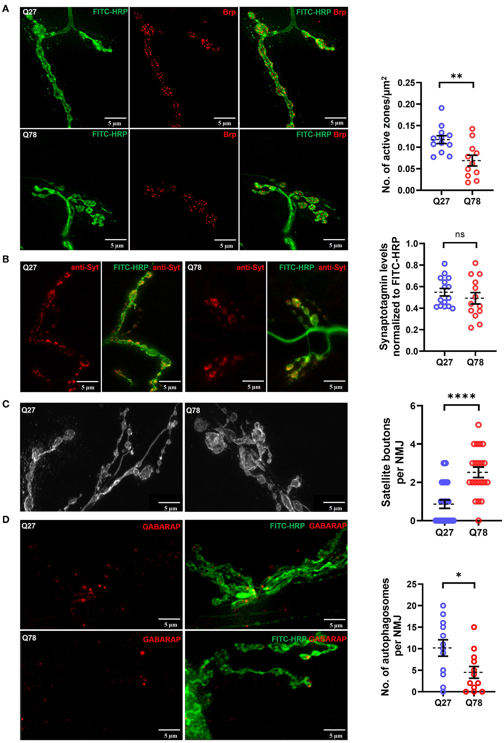 It is known that morphological changes in the NMJs are often correlated with functional defects as well, which might lead to behavioral deficits (Sleigh et al., 2014; Cappello and Francolini, 2017). We further assessed for functional defects in the boutons of NMJs. Synaptic vesicles loaded with neurotransmitters are brought close to the presynaptic membrane of the Drosophila NMJ by the concerted actions of presynaptic proteins, such as Bruchpilot (Brp) and another vesicular SNARE, Synaptotagmin (Syt), thus leading to the docking and fusion of these vesicles and concomitant release of glutamate (Quiñones-Frías and Littleton, 2021; Sauvola and Littleton, 2021). Brp and Syt are also essential at the Drosophila neuromuscular junctions for the clustering of calcium channels (Kittel et al., 2006; Wagh et al., 2006). Brp null mutants (brp69) have been shown to be defective in the fusion of glutamate-containing neurotransmitter vesicles in Drosophila NMJs (Paul et al., 2015). Thus, any changes in the levels of Brp and Syt may alter the functioning of glutamatergic synapses. Our results showed that Q78 expression in larval motor neurons led to a reduction in Brp-containing active zones but no change in Syt levels. The abundance of Brp positively correlates with neurotransmitter release (Matz et al., 2010; Weyhersmüller et al., 2011; Ehmann et al., 2014). However, in our study, it might be possible that the mutant Q78 NMJs are defective in releasing glutamate, thus correlating with behavioral deficits.
