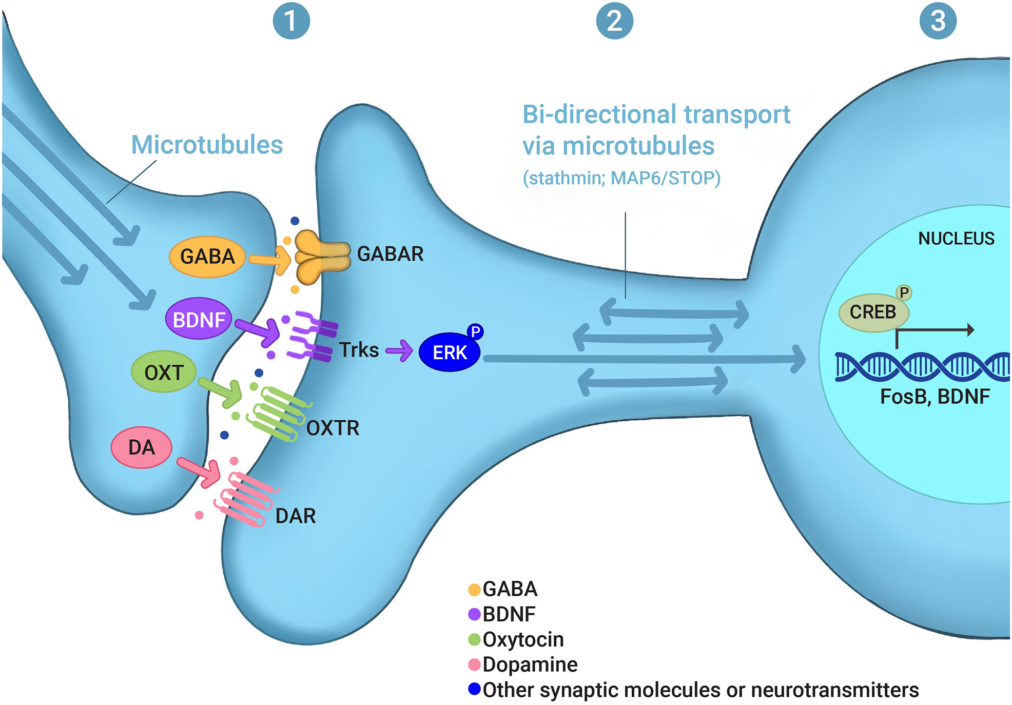 Trafficking in both directions between synapses and the nucleus is critical for activity-dependent intracellular neuronal signaling. While the critical role of trafficking has been shown for many behavioral processes including learning and memory, how important it is for maternal care remains unclear. The first step in this process is the transmission of extracellular signals received by synapses to the nucleus to induce the corresponding changes in gene transcription (Cohen et al., 2015; Herbst and Martin, 2017; Uchida and Shumyatsky, 2018b; Parra-Damas and Saura, 2019). Trafficking in the opposite direction from the nucleus and cell body supplies synapses with various cargos, including synaptic vesicle precursors, neurotransmitter and neurotrophic factor receptors, other synaptic proteins, mRNAs, and organelles (Hirokawa et al., 2010).
