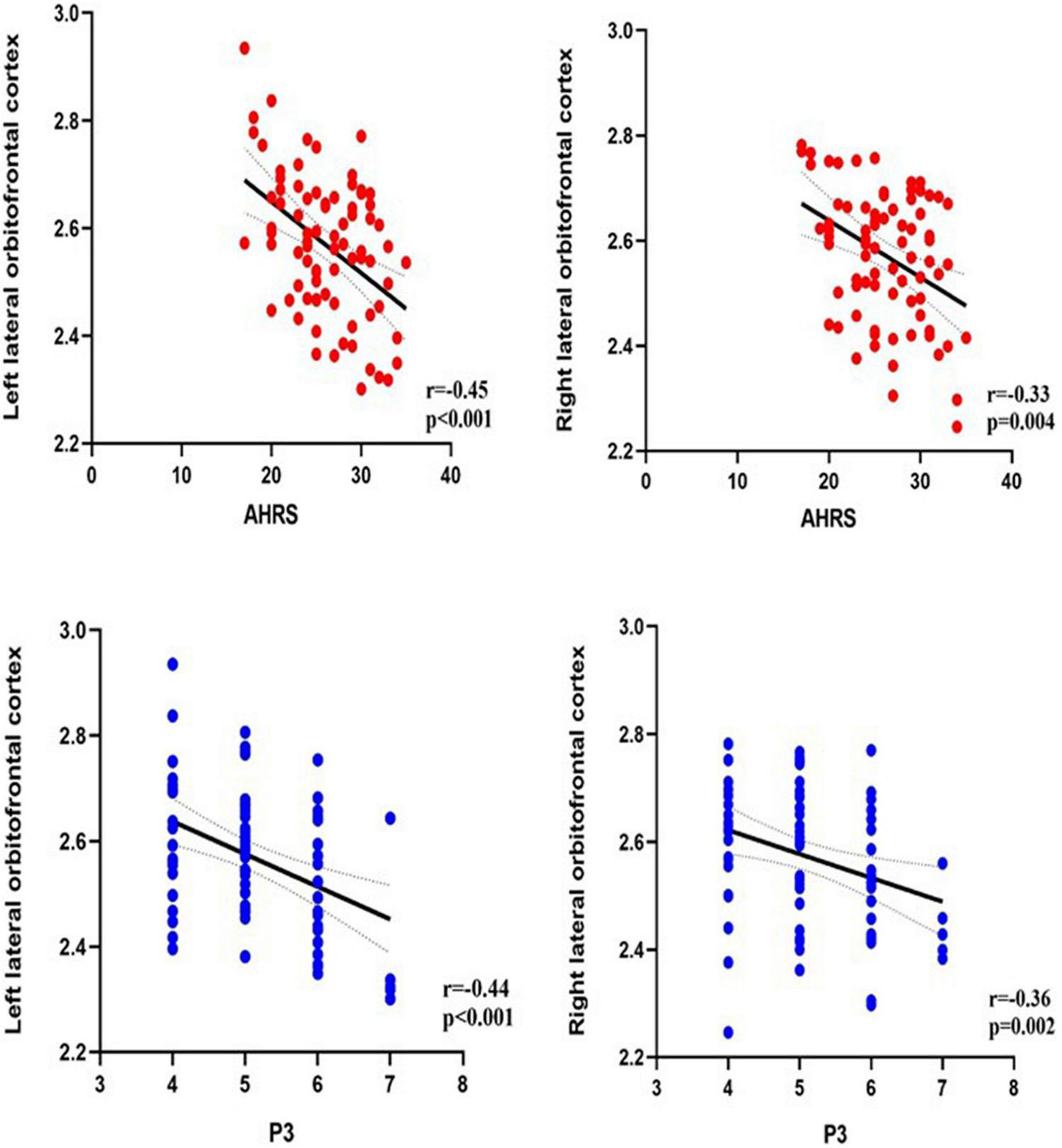 Correlation analysis was performed between the brain regions with different cortical thicknesses identified by ANCOVA and the severity of pAVH to explore the potential relationship between the differences in cortical thickness and the severity of pAVH. The cortical thickness of the bilateral lateral orbitofrontal cortices was negatively correlated with the severity of pAVH (i.e., AHRS or P3 scores) (with Bonferroni correction, p < 0.0125; see Table 3 and Figure 2).