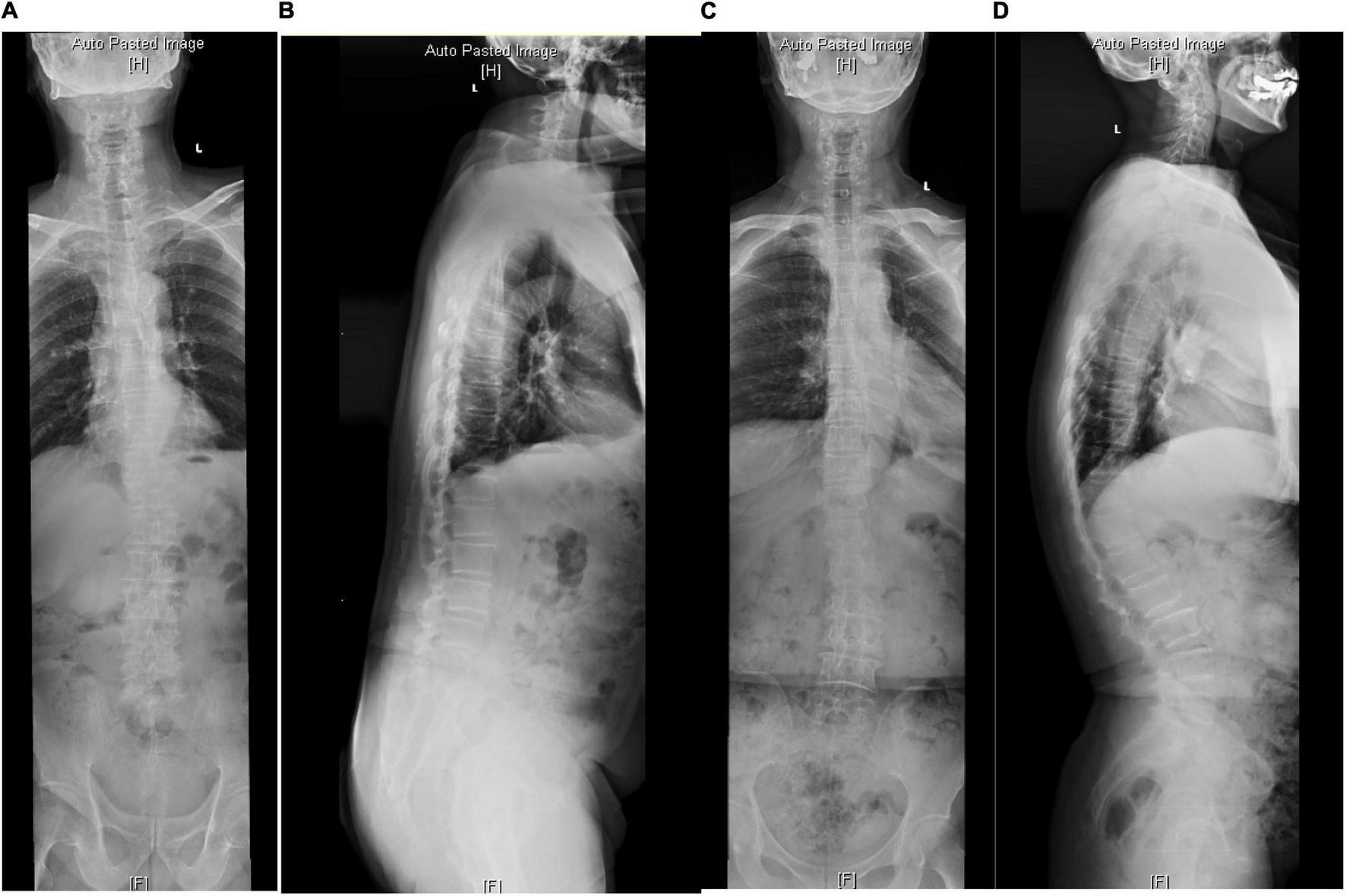 The radiological parameters measured on standard anterior-posterior and lateral whole spine X-ray of cases from the SB group. (A,B) In a 70-year-old man, TK = 58, TLK = 26.1, LL = 56.1, PI = 51, PT = 20.4. (C,D) In a 68-year-old woman, TK = 29.4, TLK = 15.2, LL = 35.3, PI = 44.7, PT = 21.