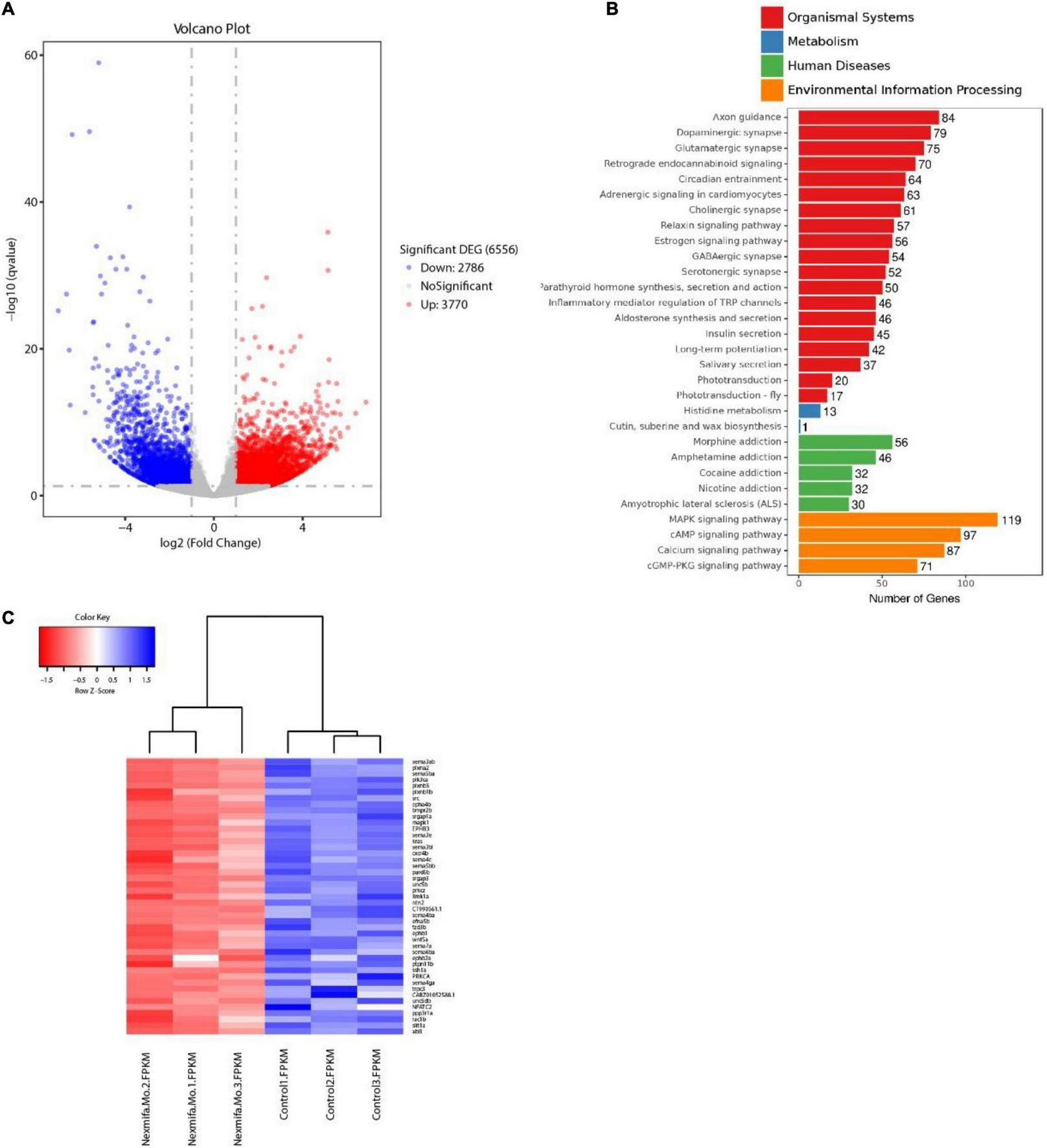 Transcriptomics profiling in nexmifa morphant and wild-type zebrafish. (A) Volcano map showing DEGs in control and nexmifa morphants. Red and blue spots represent up-regulated and down-regulated genes, respectively. (B) KEGG pathway annotation of DEGs in control and nexmifa morphants. (C) Heatmap pathway differences between control and nexmifa morphants showing down-regulated genes in axon guidance.