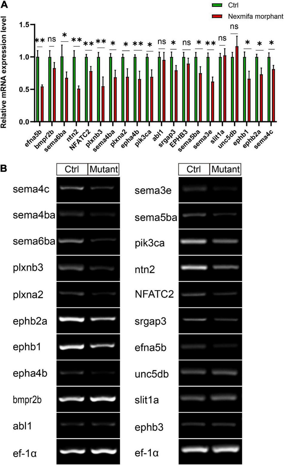 The expression of 20 down-regulated DEGs. (A) Expression of 20 down-regulated DEGs between Ctrl and nexmifa morphant by qRT-PCR. Bars represent the mean ± standard deviation (SD). *p < 0.05 and **p < 0.01. ns: non-significant. (B) Expression of 20 down-regulated DEGs between Ctrl and nexmifa mutant by RT-PCR.