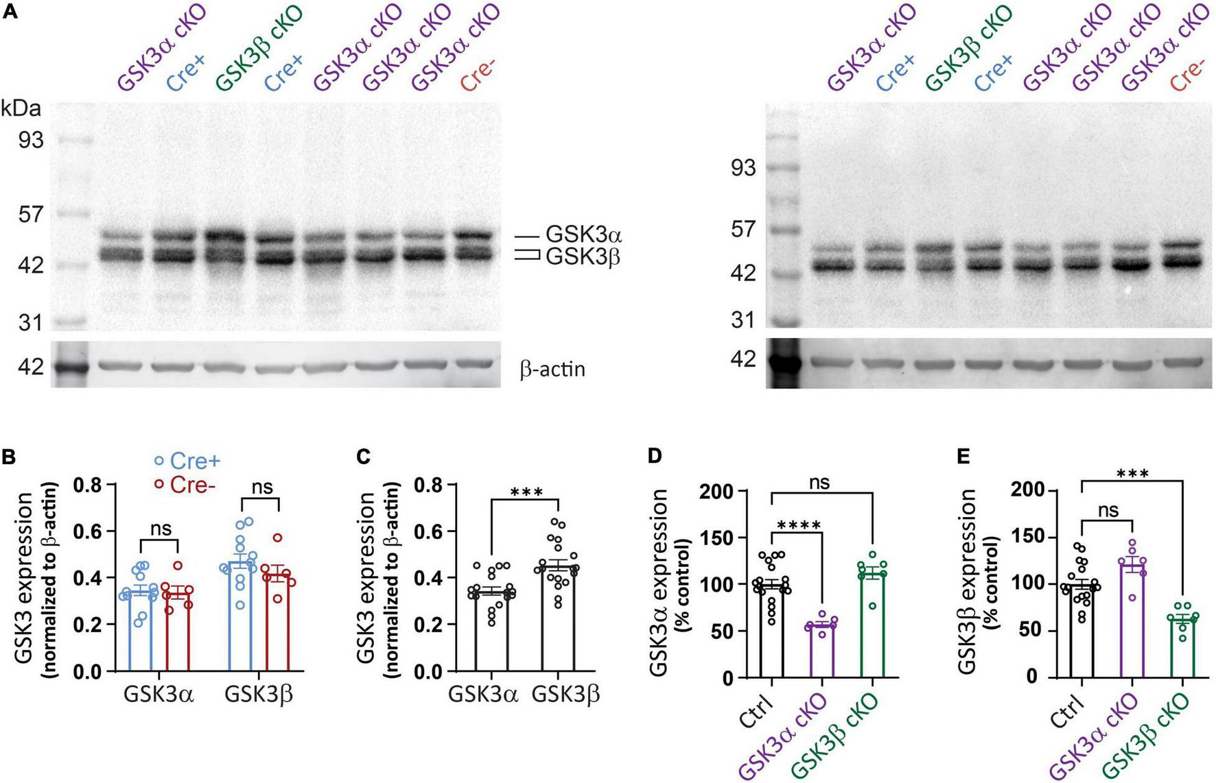 Western blot detection of targeted protein reduction in GSK3α or GSK3β cKO. (A) Western blot sample results using hippocampal lysates from tissue studied in Figures 3–5. Lysates from GSK3α cKO, GSK3β cKO, Cre+, and Cre- were loaded by the experimenter blinded to genotype and then the data was averaged from 2 to 4 technical replicates per slice. (A) Shows two of the technical replicates for samples obtained from the same 8 mice. Blots were probed initially for GSK3 and subsequently for β-actin. (B) Similar levels of expression of GSK3α and GSK3β when Cre+ and Cre- mice are compared. Note that both isoforms of GSK3β were detected and included in the analysis. (C) Quantification shows a higher signal for GSK3β compared to GSK3α for pooled control samples. (D) Reduced GSK3α expression in the GSK3α cKOs compared to control (Ctrl) samples, with no significant change in level of the GSK3β paralog. (E) Reduced GSK3β expression in the GSK3β cKOs compared to control (Ctrl) samples, which was associated with no significant change in level of the GSK3α paralog. Data for (B) were analyzed with two-way ANOVA; effect of Cre+ vs. Cre- [F(1,32) = 1.119, p = 0.2981; effect of GSK3α vs. GSK3β: F(1,32) = 12.35, p = 0.013; effect of interaction: F(1,32) = 0.563, p = 0.4584, N = 18.] Data shown in (C–E) were analyzed with an unpaired Student t-test. ***p < 0.001, ****p < 0.0001, ns, not significantly different. N = 18 for control, N = 6 for GSK3α cKO, N = 7 for GSK3β cKO.