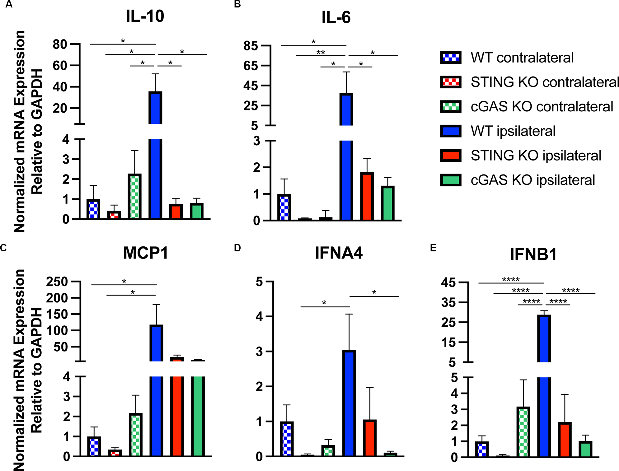 Loss of cGAS-STING blunts the innate immune response to TBI. Quantified mRNA expression of (A)Il10, (B)Il6, (C)MCP1, (D)IFNA4, and (E)IFNB1 assessed by qPCR at 24 h post-injury in wildtype, STING−/−, and cGAS−/− cortices. Gene expression normalized to GAPDH. n = 5–6 per group. Data presented as mean ± SEM. *p < 0.05, **p < 0.01, ****p < 0.0001.