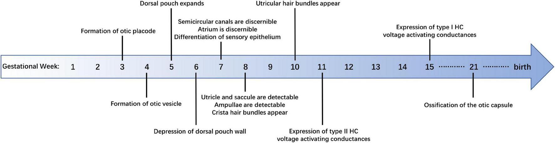 The morphogenesis of vestibular organs in humans is similar to that in rodents, but the human vestibular organs have been distinct in the early embryonic stage (by the end of GW 7, Figure 1; Streeter, 1906), while the mouse counterparts do not attain its mature shape until the late embryonic stage. The vestibular organs of mice become distinguishable on E15 and the membranous labyrinth morphology approaches maturity as late as E17 (Morsli et al., 1998).