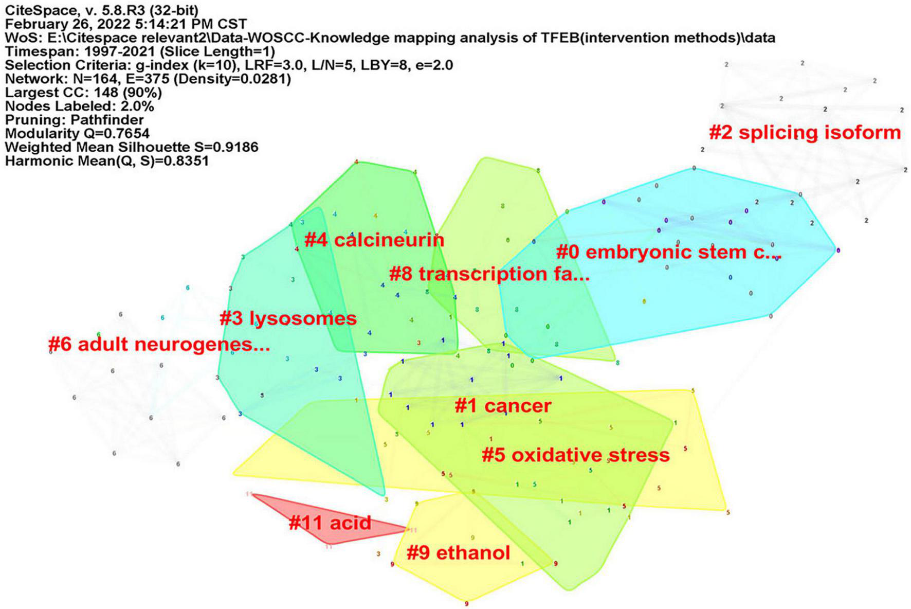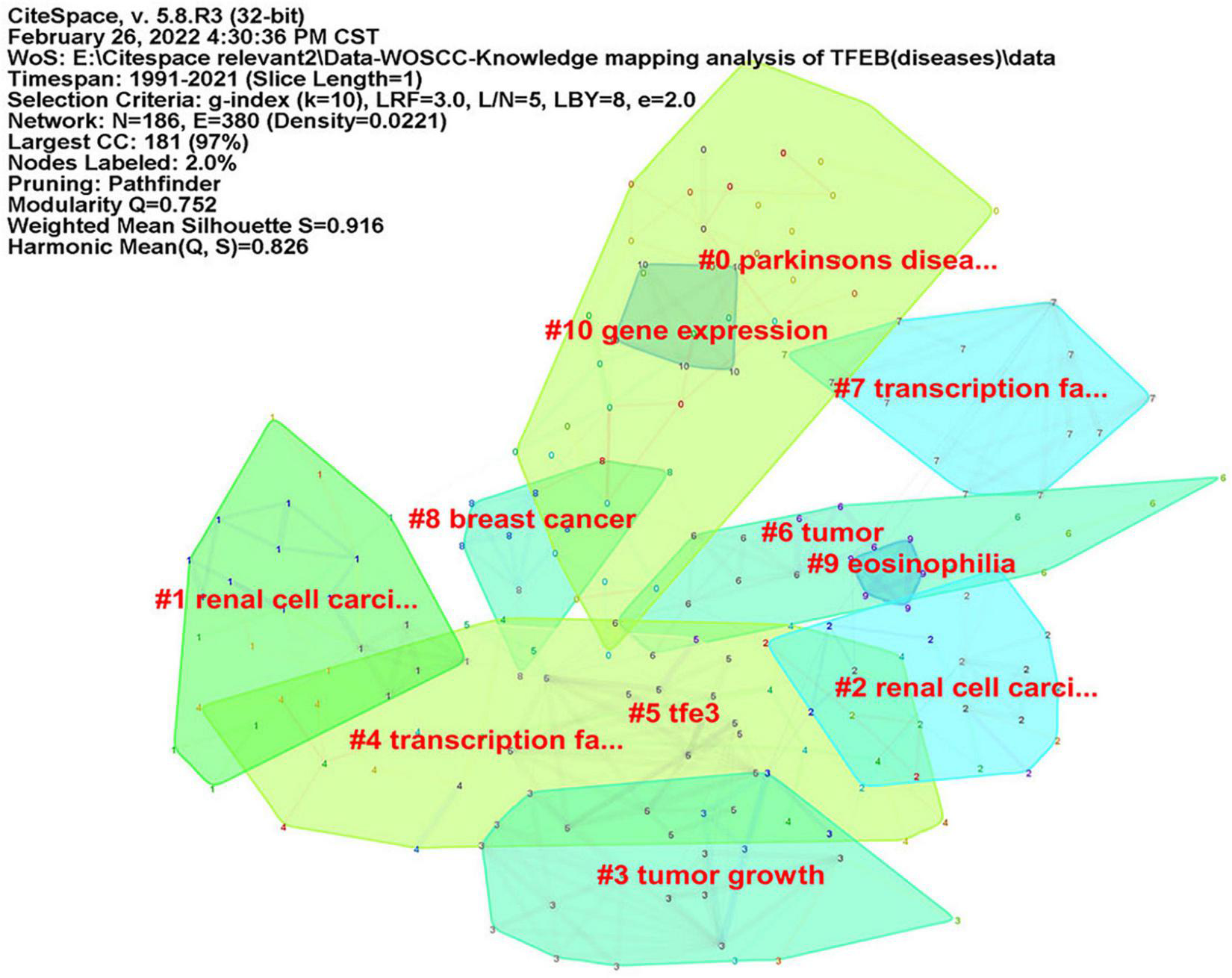 Literature retrieval was done online through the Science Citation Index-Expanded (SCI-E) of the Web of Science Core Collection (WoSCC) on February 23, 2022. The data retrieval strategy was: topic: (Transcription Factor EB) OR topic: (Transcription Factors EB) OR topic: (Transcript* Factor* EB) OR topic: (TFEB) OR topic: (Tfeb), index = SCI-EXPANDED, time span: 1991-01-01 to 2021-12-31. The following search string was used: document type: (Article), language = English.