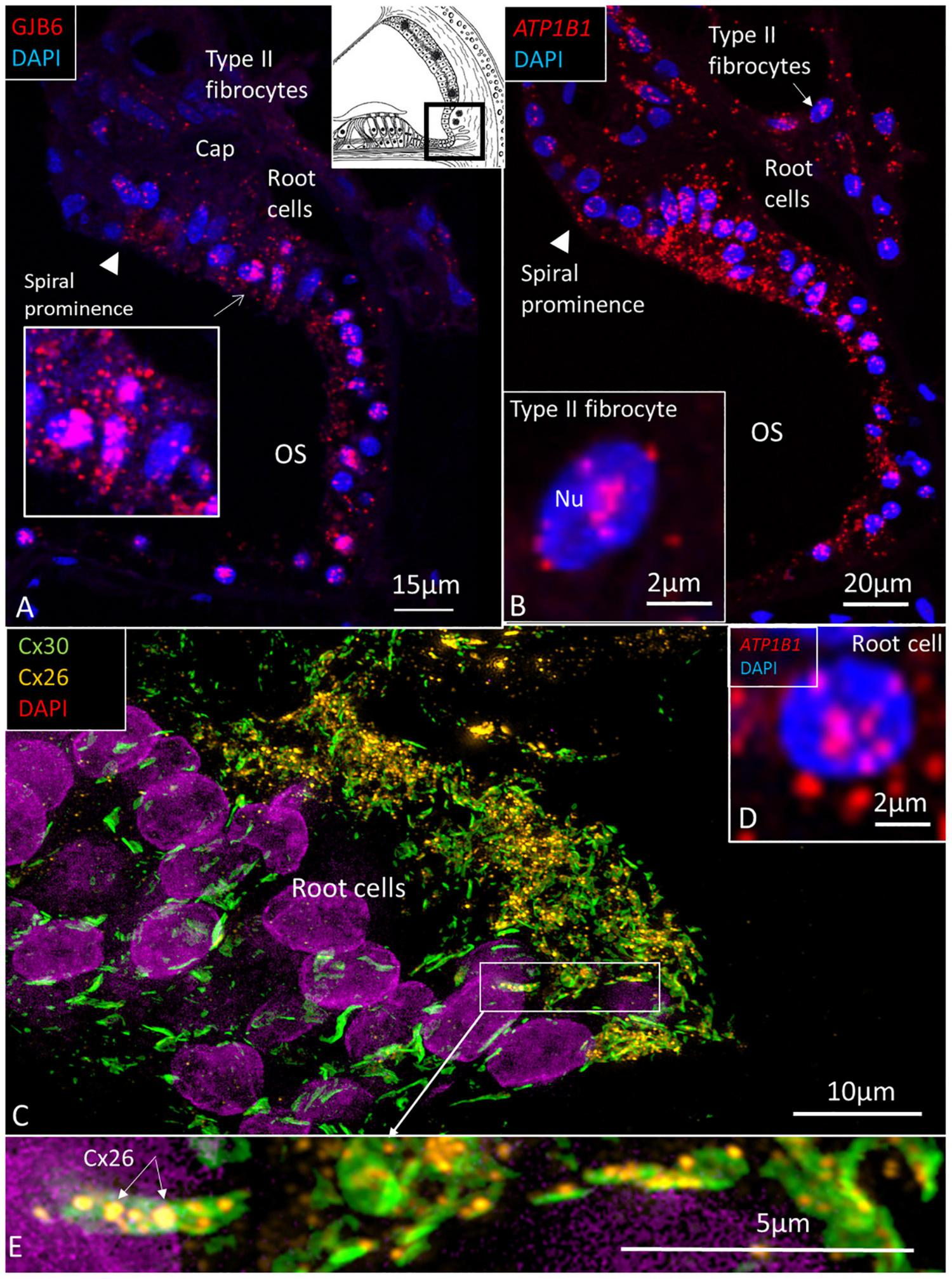 (A) The human outer sulcus epithelium demonstrates many red puncta representing GJB6 transcripts. These are also seen in type II fibrocytes. Inset shows root cells at higher magnification. (B)ATP1B1 gene transcripts are also expressed in the outer sulcus epithelium and in type II fibrocytes. Inset shows a type II fibrocyte at higher magnification with mRNA transcripts located in the nucleus (Nu) and at nuclear pore regions. (C) SR-SIM shows expression of Cx26 and Cx30 in the root cells. Inset (D) shows a root cell expressing ATP1B1. Framed area is magnified in (E), showing several large Cx30 GJ plaques in the root cells and associated Cx26 plaques (arrows). OS, outer sulcus; Cap, capillary.