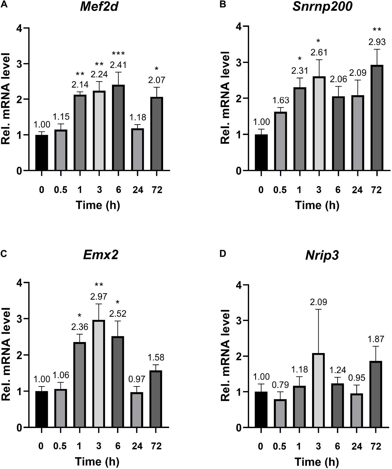 mRNA expression of the Plaur-miR1-3p and Plaur-miR1-5p target genes Mef2d, Snrnp200, Emx2, and Nrip3 in mouse striatum. qPCR analysis of (A)Mef2d, (B)Snrnp200, (C)Emx2 and (D)Nrip3 expression in the striatum of control mice (treated with saline, 0 h) and mice 0.5, 1, 3, 6, 24, and 72 h after endogenous Plaur induction. The data are presented as mean ± SEM (n = 4), normalized to Actb (encodes β-actin) expression as a reference gene. The data were analyzed by using analysis of variance followed by Dunnett’s multiple comparisons test with GraphPad Prism software. Statistical significance is indicated by bars and asterisks as follows: *p < 0.05; **p < 0.01; ***p < 0.001.