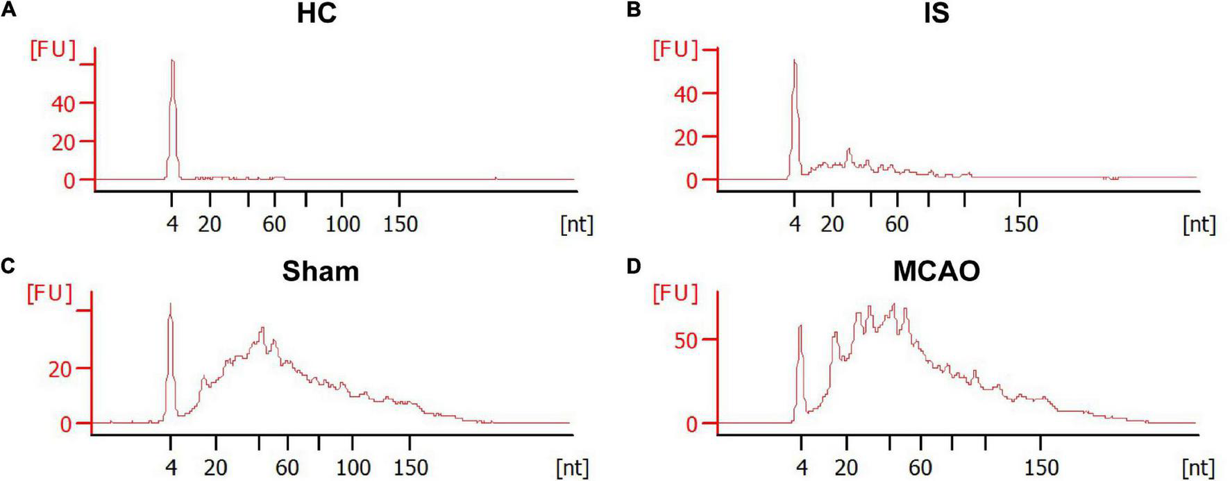 The size distribution and relative abundance of sEVs RNA from IS patients and healthy controls, and tMCAO mice and sham controls. The electropherograms delineate the size distribution in nucleotides (nt) and fluorescence intensity (FU) of small RNA in serum sEVs. The representative electropherograms of HCs (A) and IS patients (B); sham (C) and tMCAO mice (D).