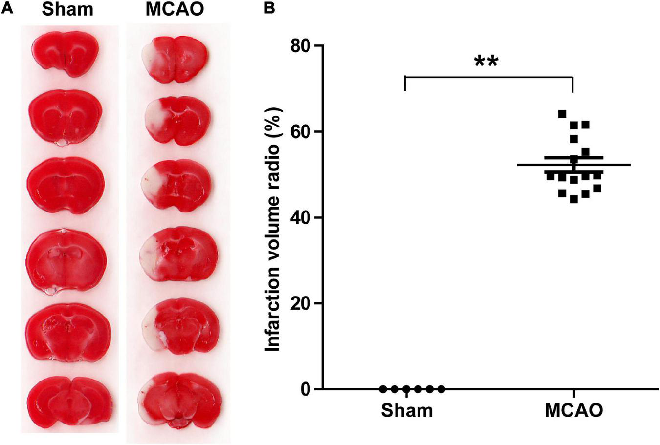 For TTC staining, the brain was sectioned coronally at 1-mm thickness. The slices were immersed in 1% 2,3,5-triphenyltetrazolium chloride (TTC, Sigma Aldrich, St. Louis, MO, United States) in saline for 30 min at 37°C and then fixed with 4% paraformaldehyde. Infarction volume was measured on six coronal sections using ImageJ.1 The indirect infarct area, in which the intact area of the ipsilateral hemisphere was subtracted from the area of the contralateral hemisphere, was calculated. The ischemic volume was presented as the percentage of infarct volume of the contralateral hemisphere.