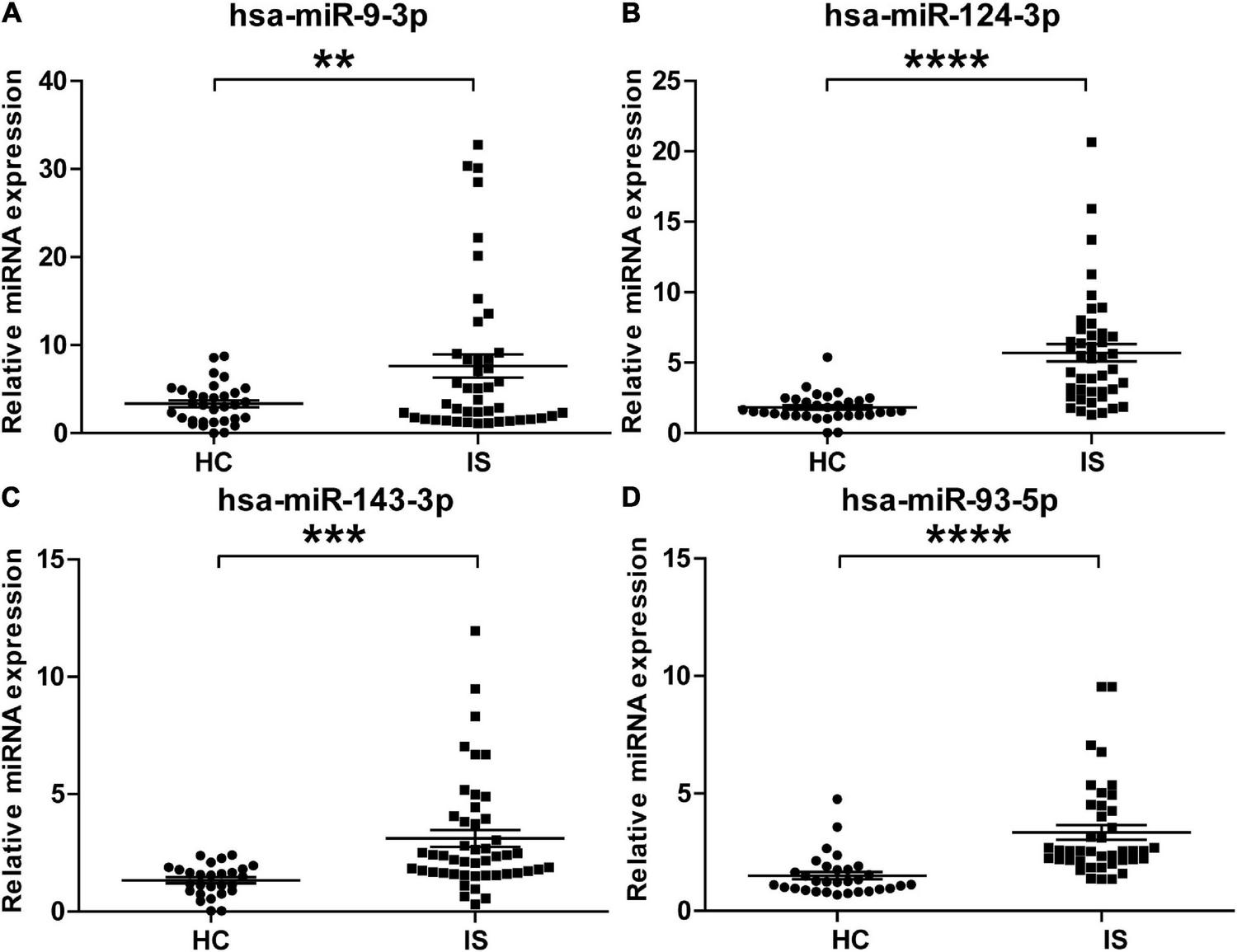 In this study, 1,084 and 990 known miRNAs were identified in the two HC groups, and 1,113 and 1,021 were identified in the two IS patient groups (Supplementary Table 5). These analyses identified 1,444 miRNAs, accounting for 54.2% of known human miRNAs (miRbase Release 22.1, 2,656 mature miRNAs, Homo sapiens). Differential expression analysis revealed that 208 and 216 miRNAs were up- and downregulated in IS patients, respectively (Supplementary Tables 6, 7), accounting for 29.4% (424/1,440) of the total identified miRNAs. Notably, these differentials were low abundance miRNAs, as the sum read counts of these 424 differential miRNAs accounted for only less than 1% of the total identified. Considering the technical challenge of PCR analysis of these low abundance miRNAs, we focused on the top 25 overexpressed miRNAs, whose read counts accounted for over 85% of the upregulated in IS patients (Table 2). In the downregulated, miR-122-5p was the most abundant miRNA, whose read counts accounted for over 10% of those downregulated.