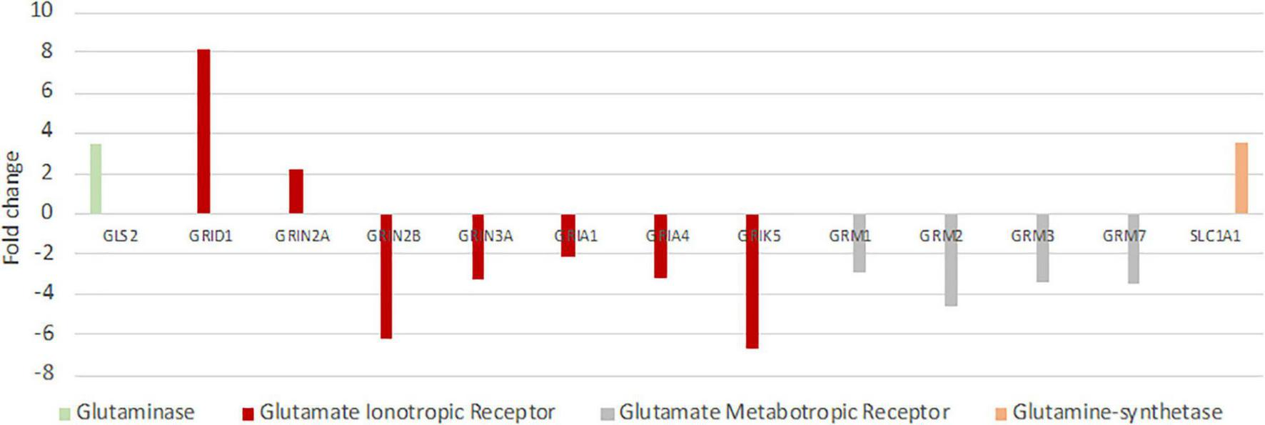 Differential expression of genes playing key roles in glutamatergic synaptic transmission and the glutamine-glutamate-cycle in hooded seals compared to neurons of mice. Positive fold changes represent a higher expression in seal neurons.