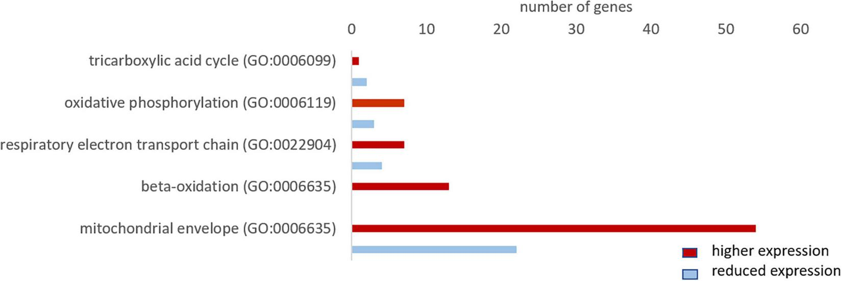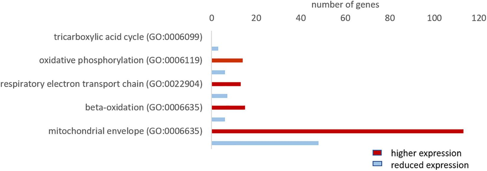 Since oxygen is vital for the production of ATP in the mitochondria, we investigated whether the hypoxia-tolerant seal neurons show adaptations in their aerobic metabolism. The GO analysis revealed that genes related to mitochondria organization and function were more highly expressed in the hooded seal (Figure 2). To get a more detailed picture, we analyzed related GO terms and found that ∼70% of the genes related to “oxidative phosphorylation,” “respiratory electron transport chain” and “beta-oxidation” were more highly expressed in seal neurons than in mouse neurons (Figure 6). For “tricarboxylic acid cycle” we found only 3 genes that matched our criteria (Figure 6), which might not be very informative. When setting a lower FC cutoff (FC ≥ 1.5 or ≤ –1.5), we found almost even numbers, i.e., 6 and 5 genes being more highly and less expressed, respectively, in seal neurons. Moreover, 70% of genes related to the GO term “mitochondrial envelope” were more highly expressed in seal than in mouse neurons (Figure 6), suggesting that not only mitochondrial function, but also mitochondrial numbers, are enhanced in seal neurons.