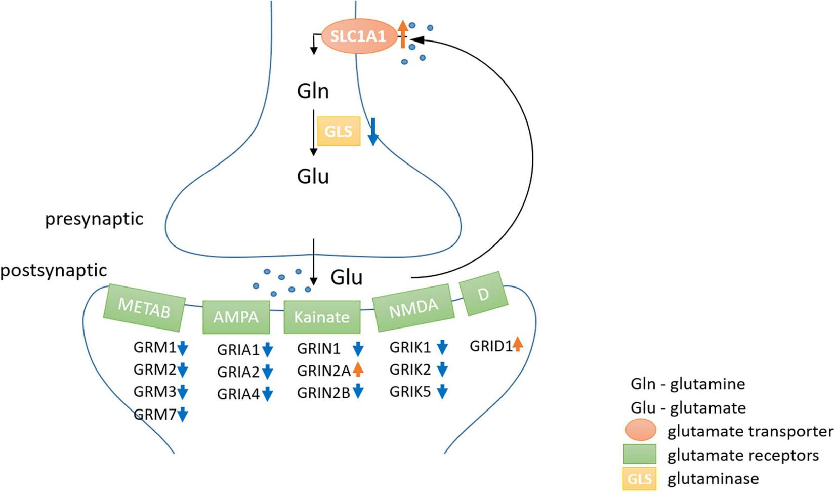 Since failure of glutamate reuptake from the synaptic gap during hypoxia causes neurotoxicity as part of the excitotoxic cascade (e.g., Swanson et al., 1995; Lutz et al., 2003), adaptations in the glutamate-glutamine cycle could be one major molecular mechanism to cope with hypoxic conditions. Thus, we investigated this cycle in greater detail. Genes involved in the positive regulation of “synaptic transmission, glutamatergic” were typically less expressed in seal neurons (up to FC –20), whereas genes playing a role in the negative regulation were more highly expressed in seals (up to FC 3.6) (Supplementary Table 3). Further, almost all glutamate receptors show a reduced expression in seal neurons (Figure 5). Additionally to the receptors presented in Figure 5, three more glutamate receptors were significantly less expressed in seals neurons but not quite meeting our criteria of FC ≤ –2 (GRIN1: FC = –1.5, GRIA2: FC = –1.9, GRIA3: FC = –1.9). Glutaminase (GLS, FC = –1.4), hydrolyzing glutamine to glutamate in neurons, was significantly less expressed in seal neurons. The neuronal glutamate transporter, crucial in removing glutamate from the synaptic cleft, was more highly expressed in seal neurons (SLC1A1, FC = 3.5) (Figure 5).