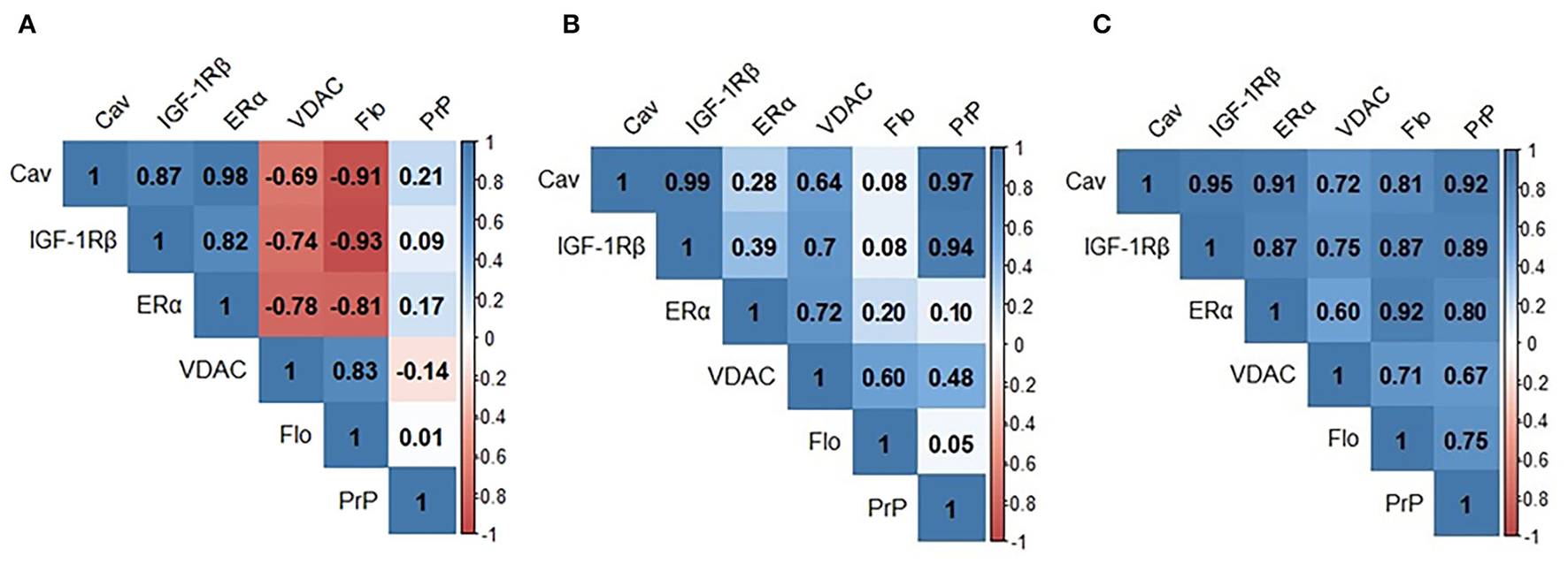 Pearson's correlation matrixes for signalosome proteins in the CSF of HC (A) SMC (B) and MCI (C) groups. Blue scale is used for positive correlations and red scale for negative correlations. Cav, caveolin; IGF-1Rβ, Insulin-like growth factor-1 receptor β; VDAC, voltage dependent anion channel; Flo, flotillin; PrP, Prion protein.