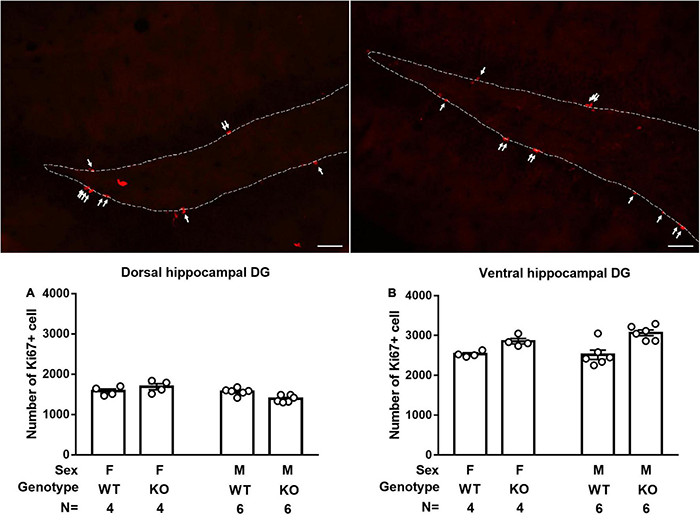 Male and female WT mice had indistinctive numbers of Ki67-positive cells in the dorsal and ventral hippocampal DG (Figure 5A). SEPT14 KO and WT mice had an indistinctive number of newly proliferated cells in the dorsal hippocampal DG in male and female mice (Figure 5A). In contrast, SEPT14 KO mice had greater newly proliferated cells than that same-sex WT mice in ventral hippocampal DG, regardless of sex [F(1,16) = 23.17, p = 0.0002] (Figure 5B).